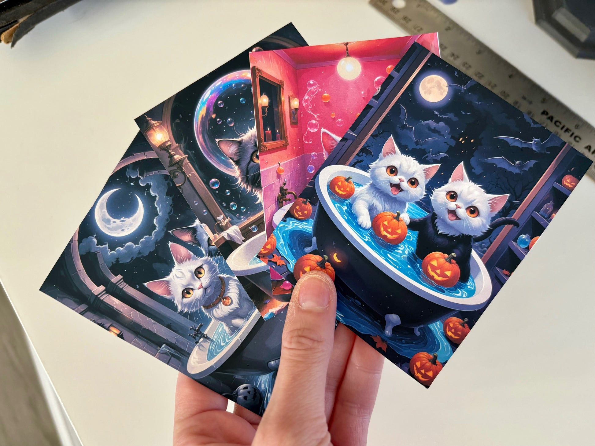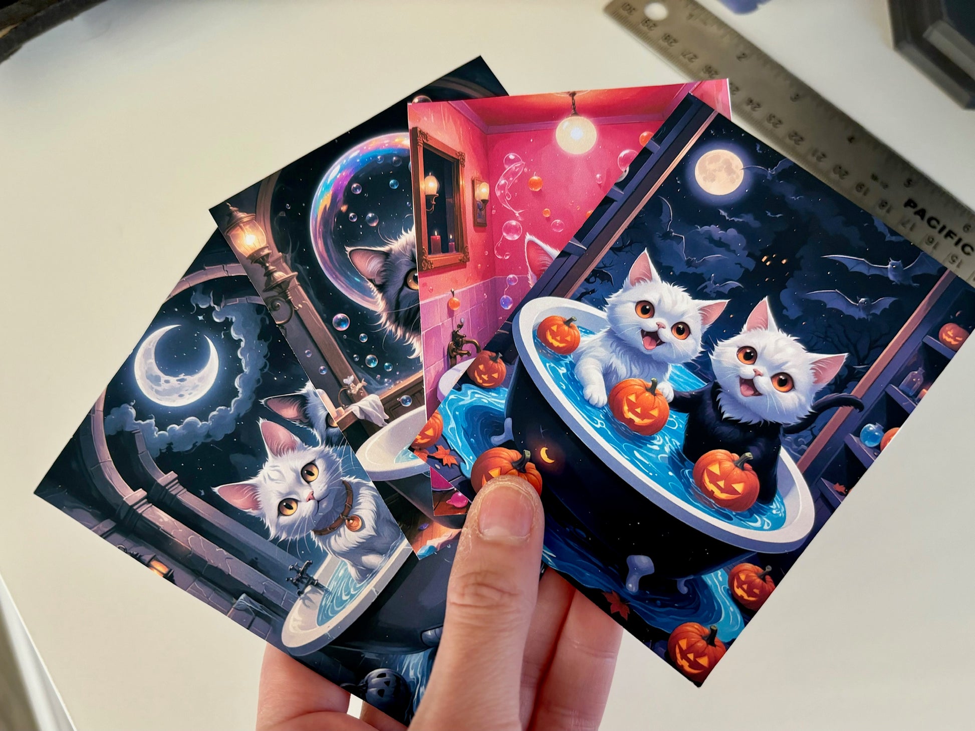 Introducing the Cat in Bathtub Sticker Pack, featuring 4 charming designs. Each ~3x4 inch sticker is printed on high-quality vinyl and carefully crafted with the help of AI technology and traditional graphic design skills. Made in the USA and hand-cut for a truly unique touch. Perfect for any cat lover.