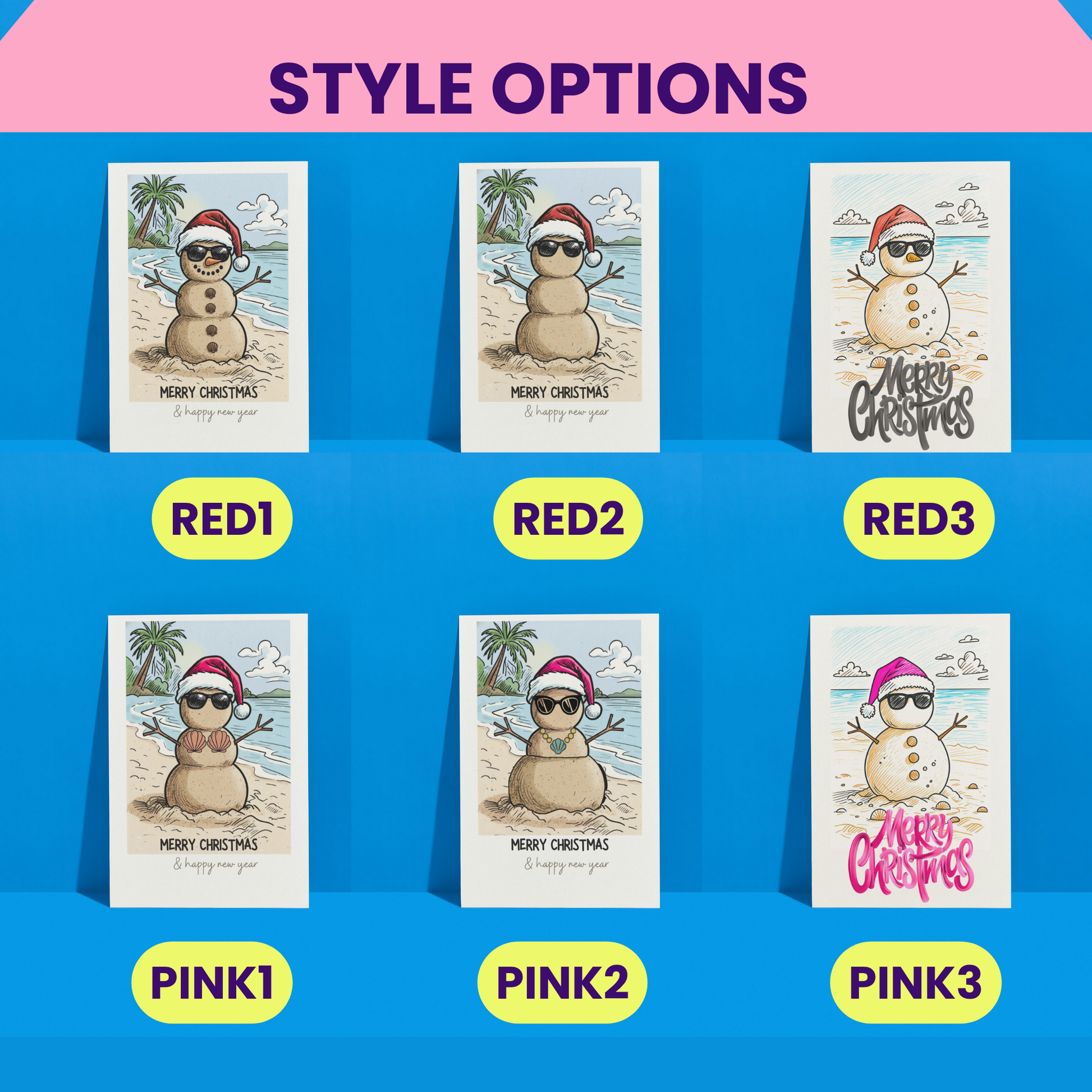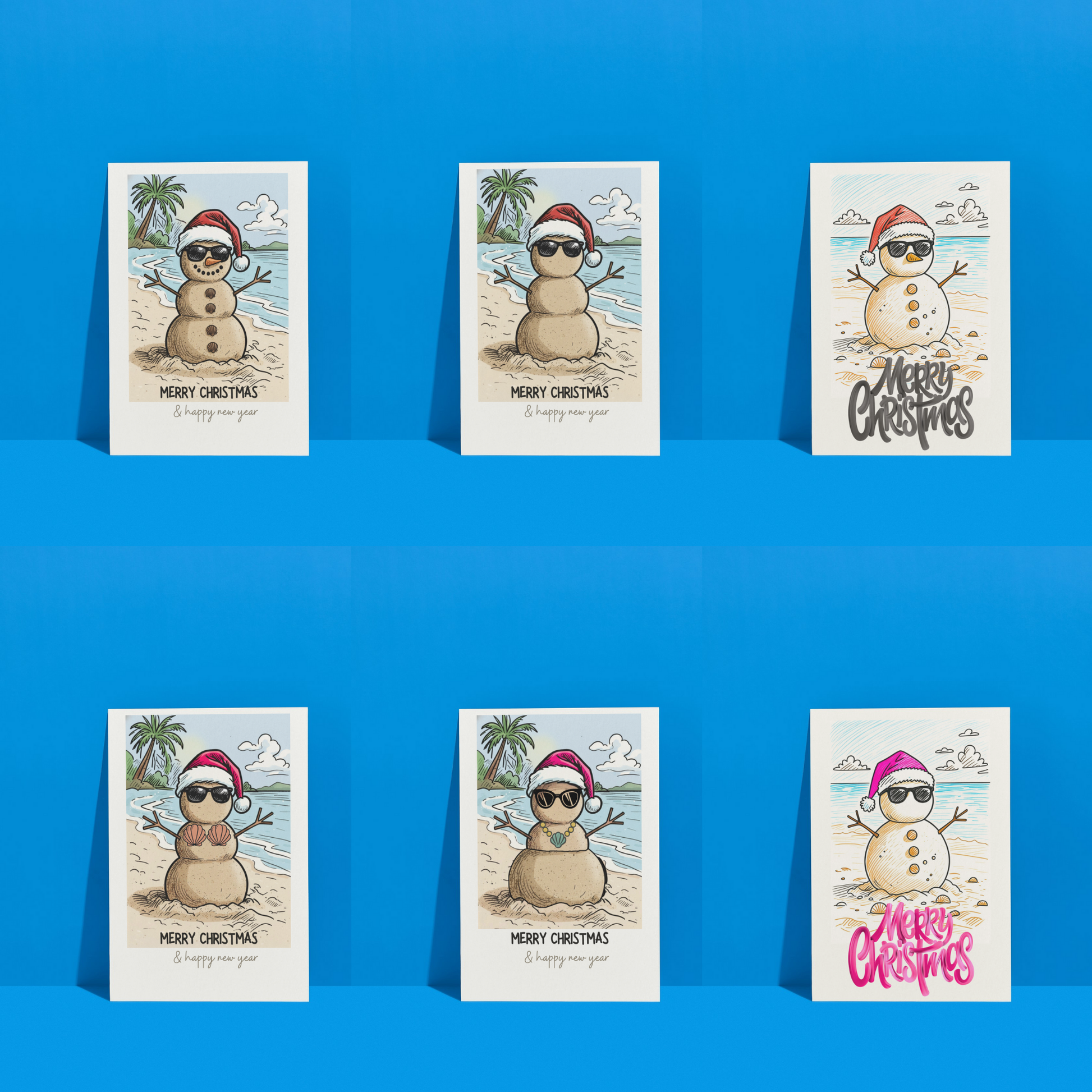 Send warm holiday wishes with our unique beachy Christmas Sand Snowman cards! Featuring original artwork by PictureThisPasadena, these cards are printed on high-quality Thermal Dye Sublimation Photo Paper for vibrant colors and details. Each set includes two 4”x6” postcard-style cards and two pink envelopes, thoughtfully packaged in cellophane sleeves. Give the gift of a sunny Christmas this year!
