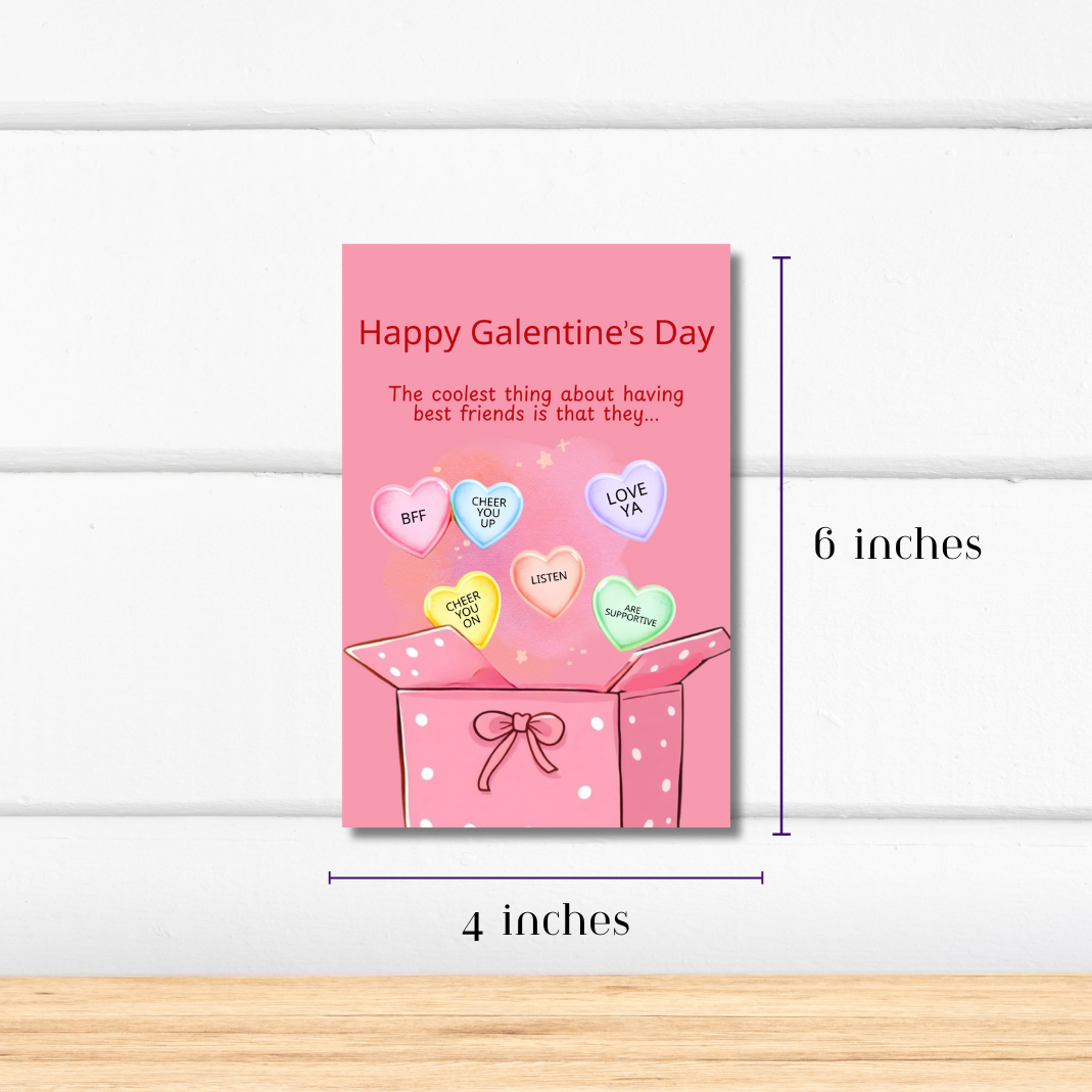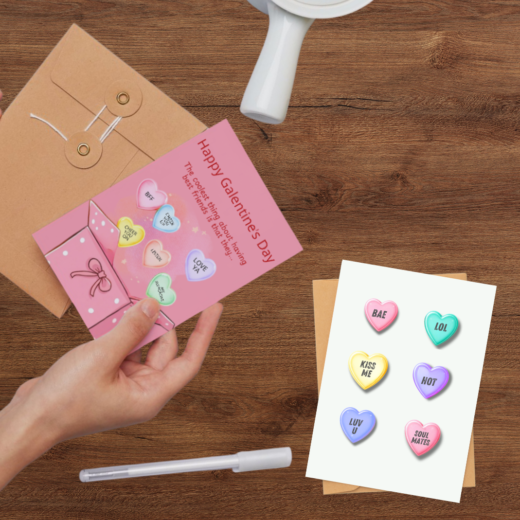 The Conversation Hearts Card measures 4”x6” and is designed specifically for Galentine’s or Valentine’s greetings. Featuring a blank backside for personalized messages, it is printed using thermal dye sublimation technology, ensuring vibrant colors and durability. This card serves as a thoughtful medium for heartfelt communication. Select from two unique designs.