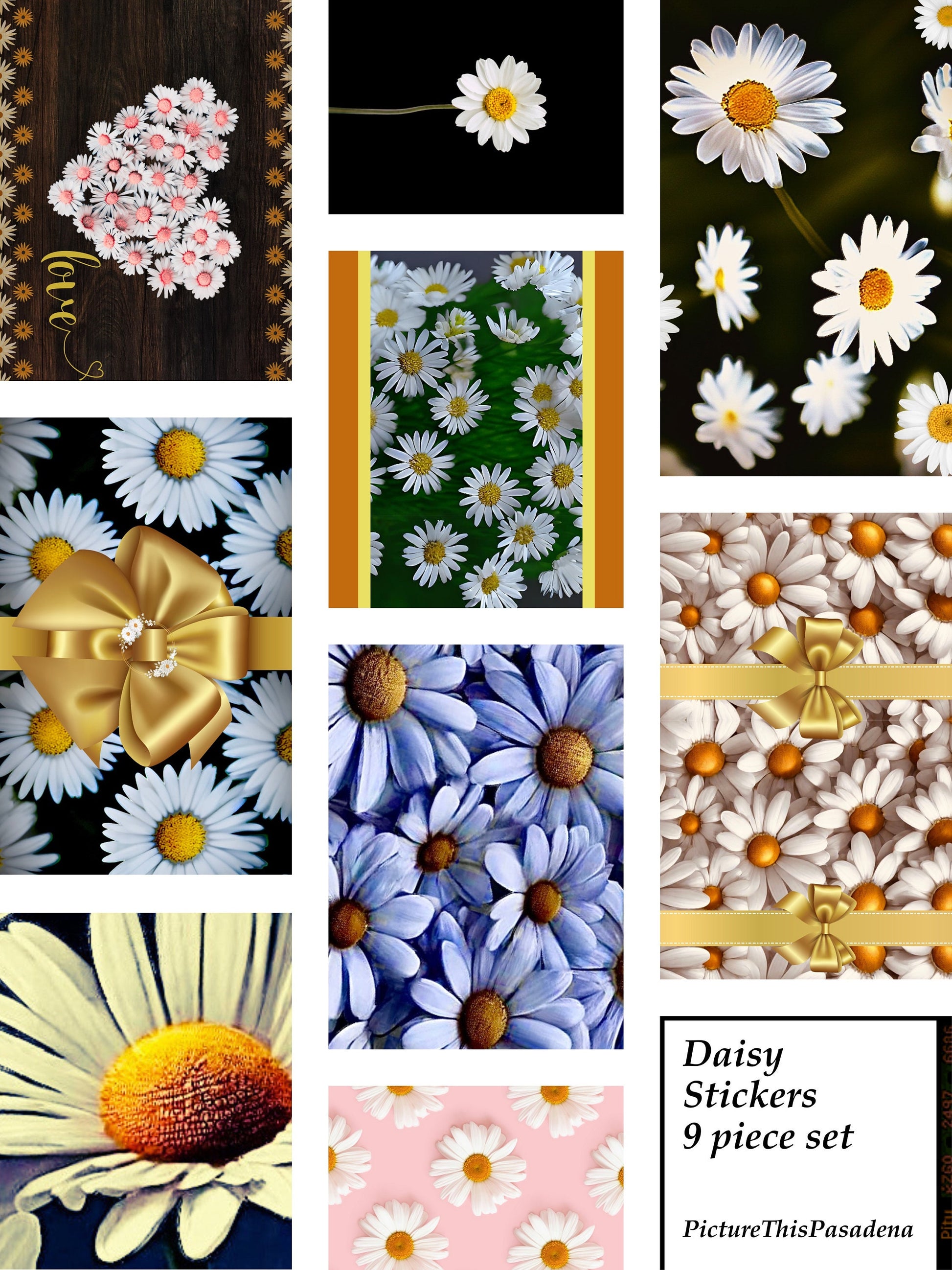 Purchase PictureThisPasadena's Daisy Sticker Set including 9 premium stickers at the listed price. These high-quality vinyl stickers are perfect for Scrapbooking and make great gifts for decorating notebooks, laptops, and more. Each sticker is made to order and shipped within 2 days, printed and hand cut in California. Please note that colors may appear different on screen than in person, and images may be enlarged for detail.