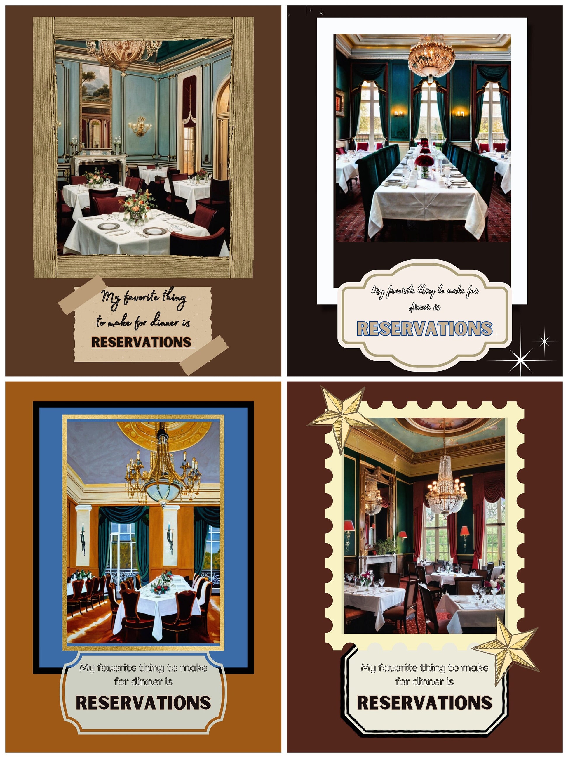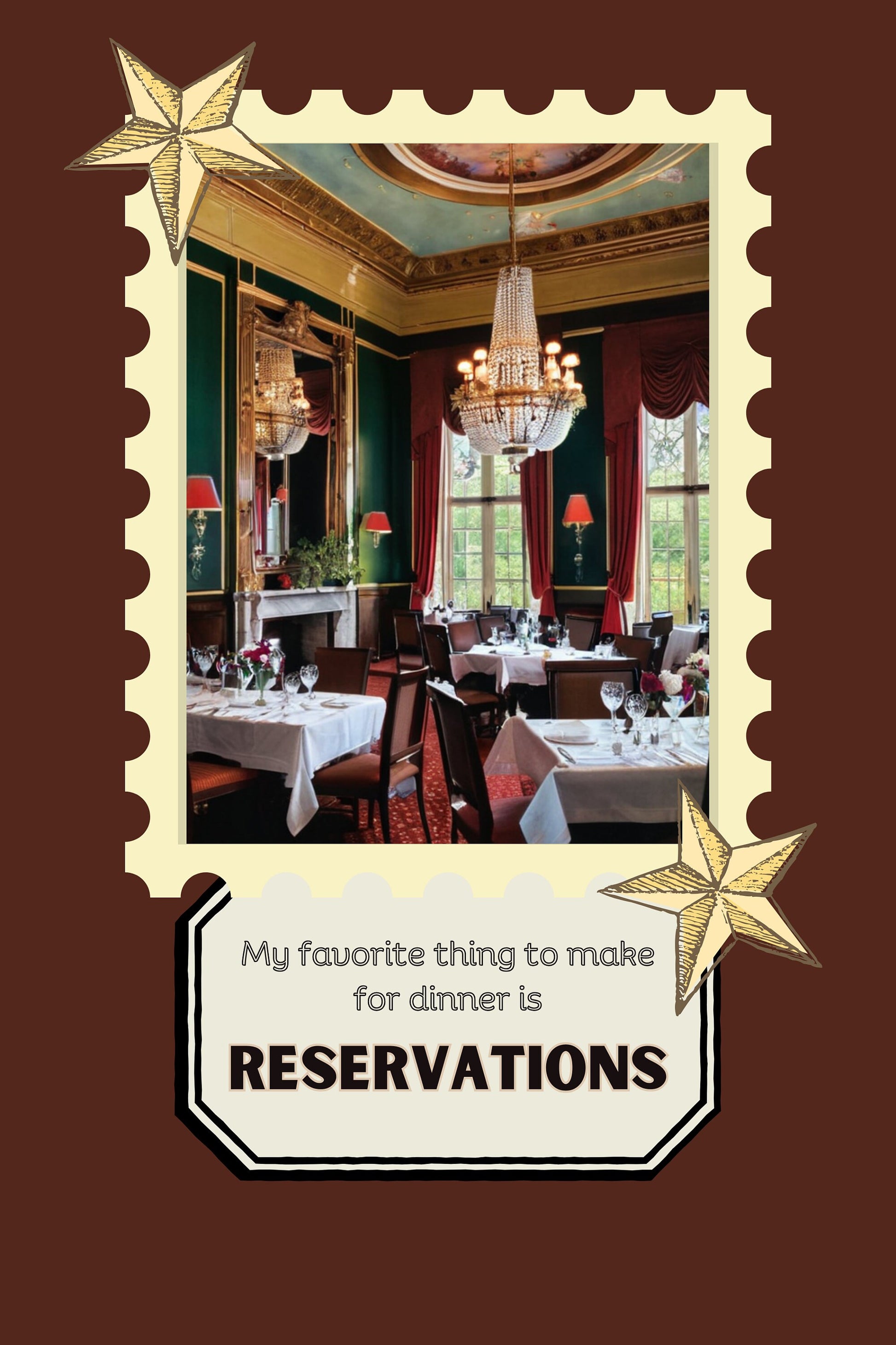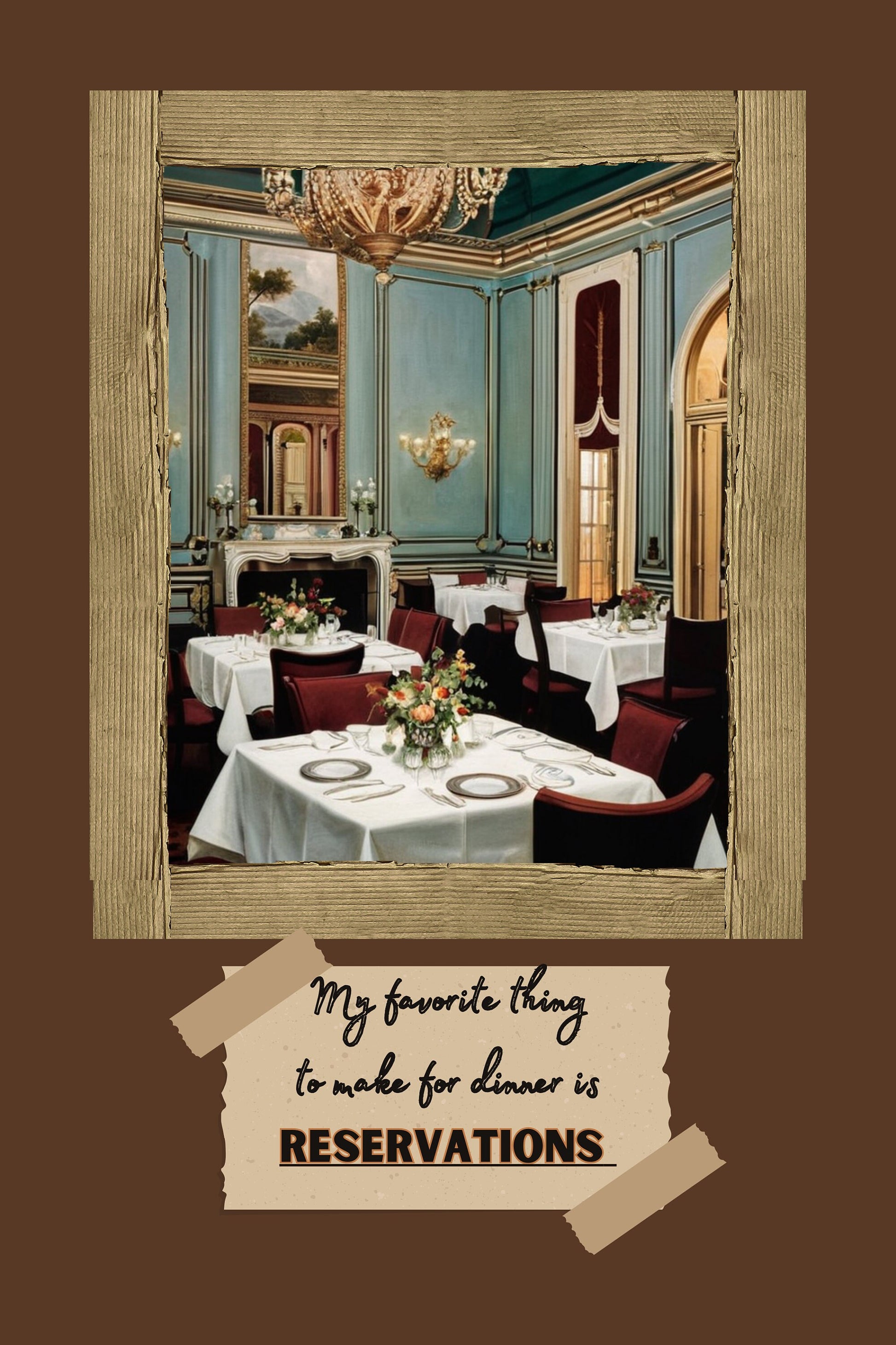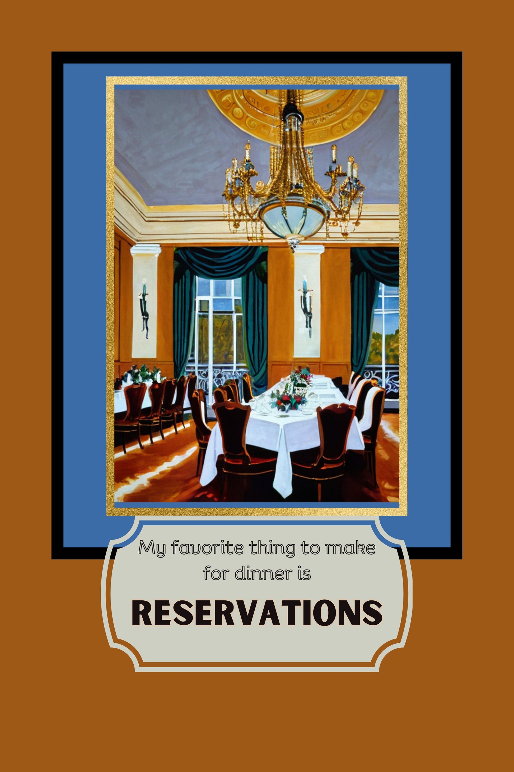 “Elevate Your Culinary Experience: This charming magnet features a whimsical twist on dining out. A picturesque restaurant facade beckons, and the cheeky caption reads, ‘My favorite thing to make for dinner is reservations.’ Whether you’re a foodie or simply appreciate the art of fine dining, this magnet adds a touch of elegance to any kitchen decor. Bon appétit!” 🍽️✨