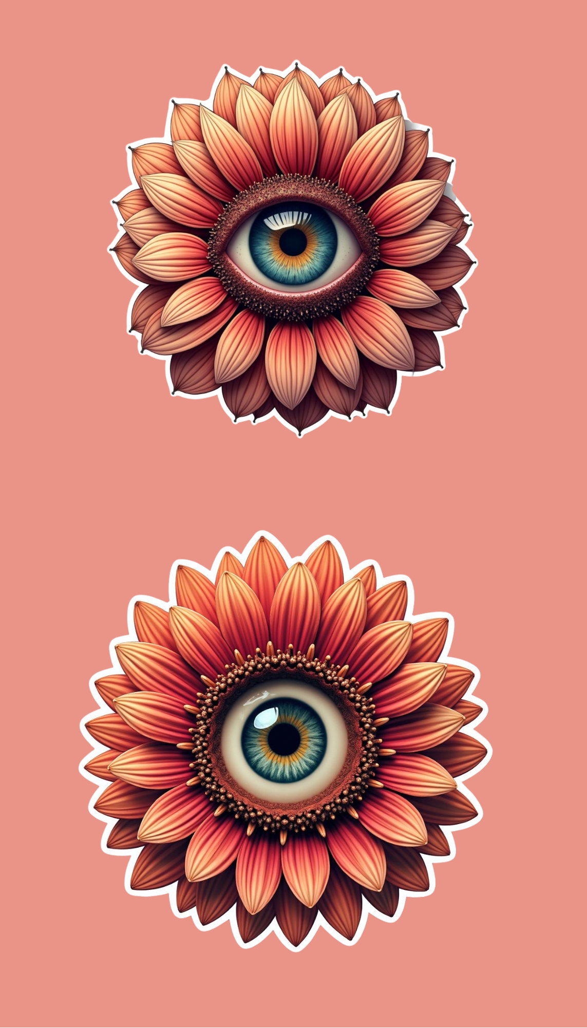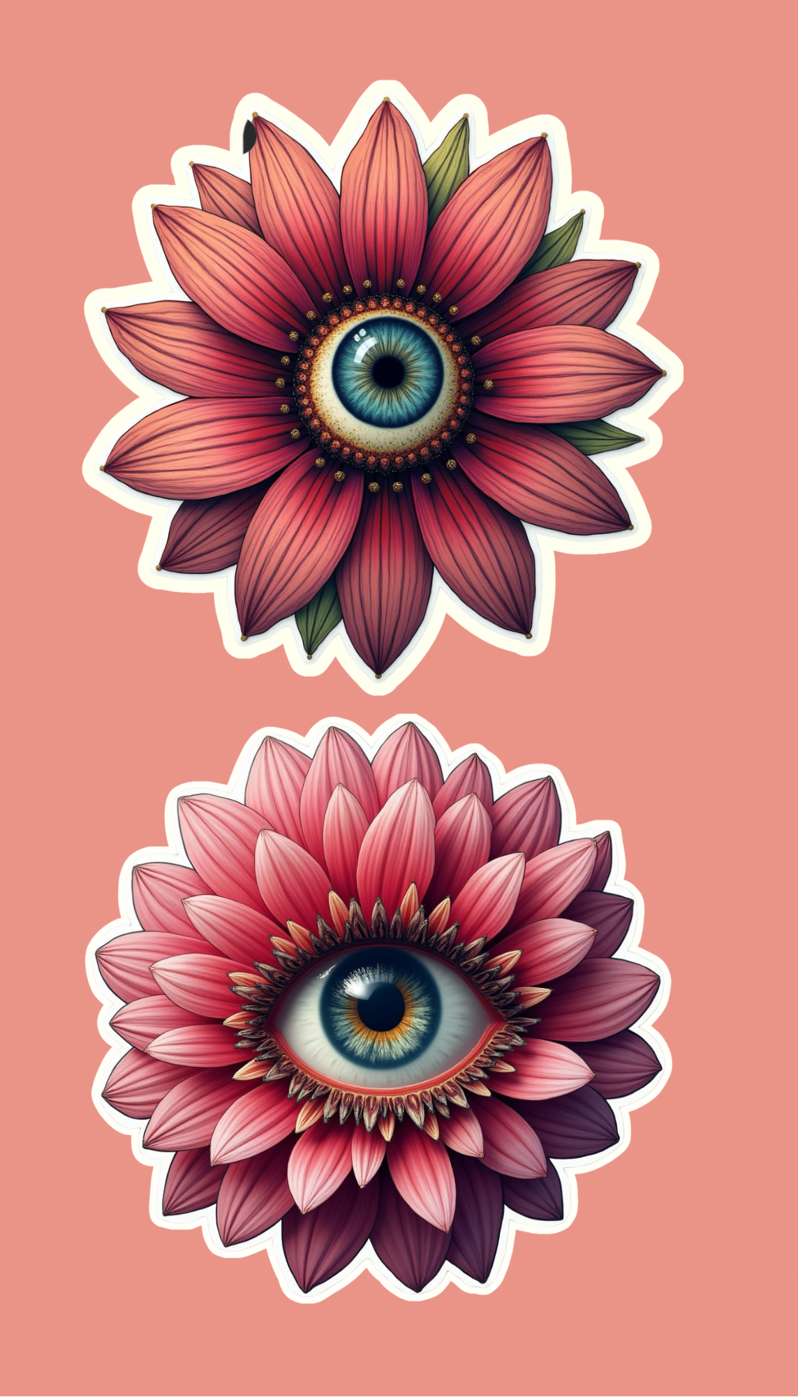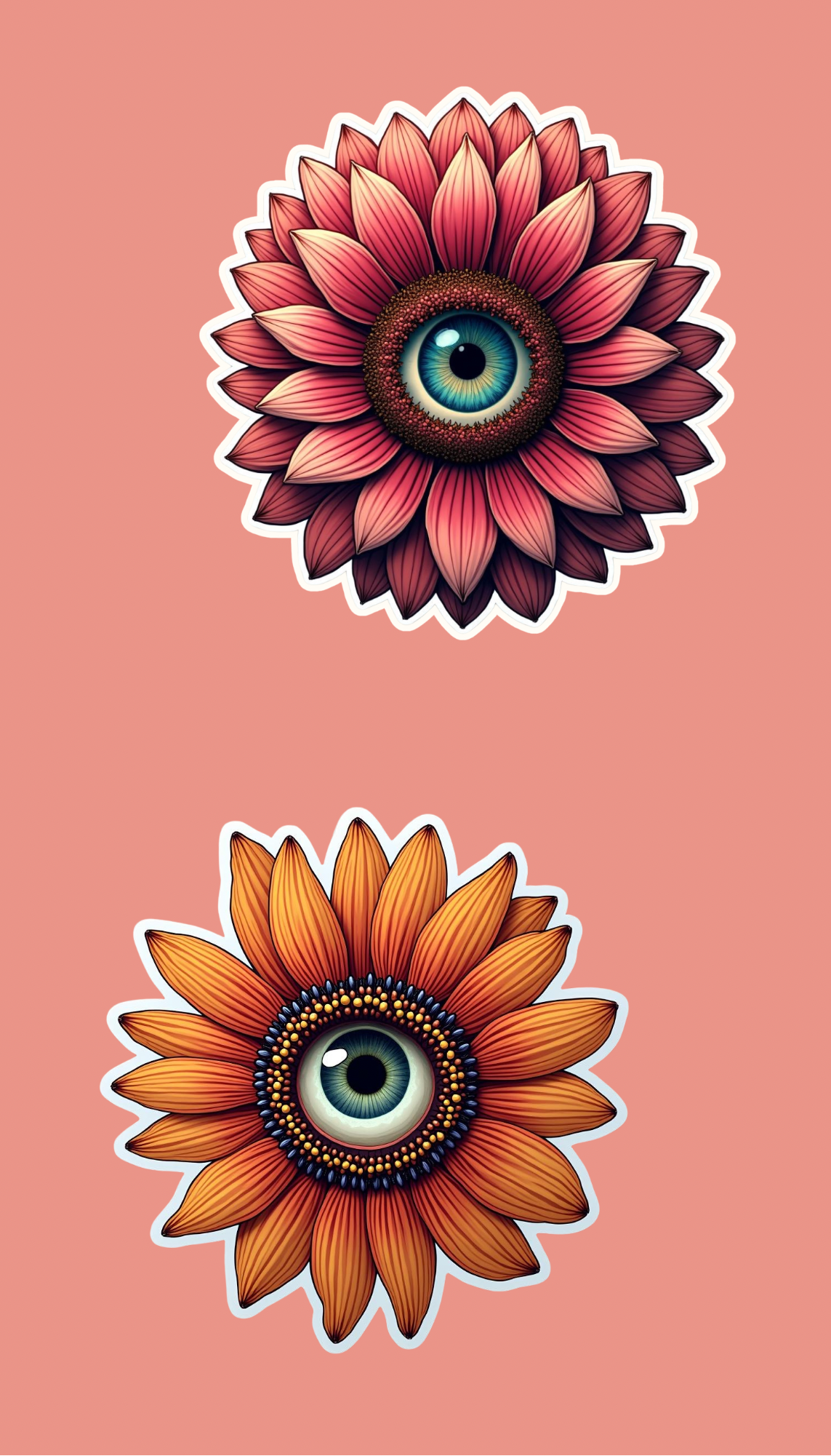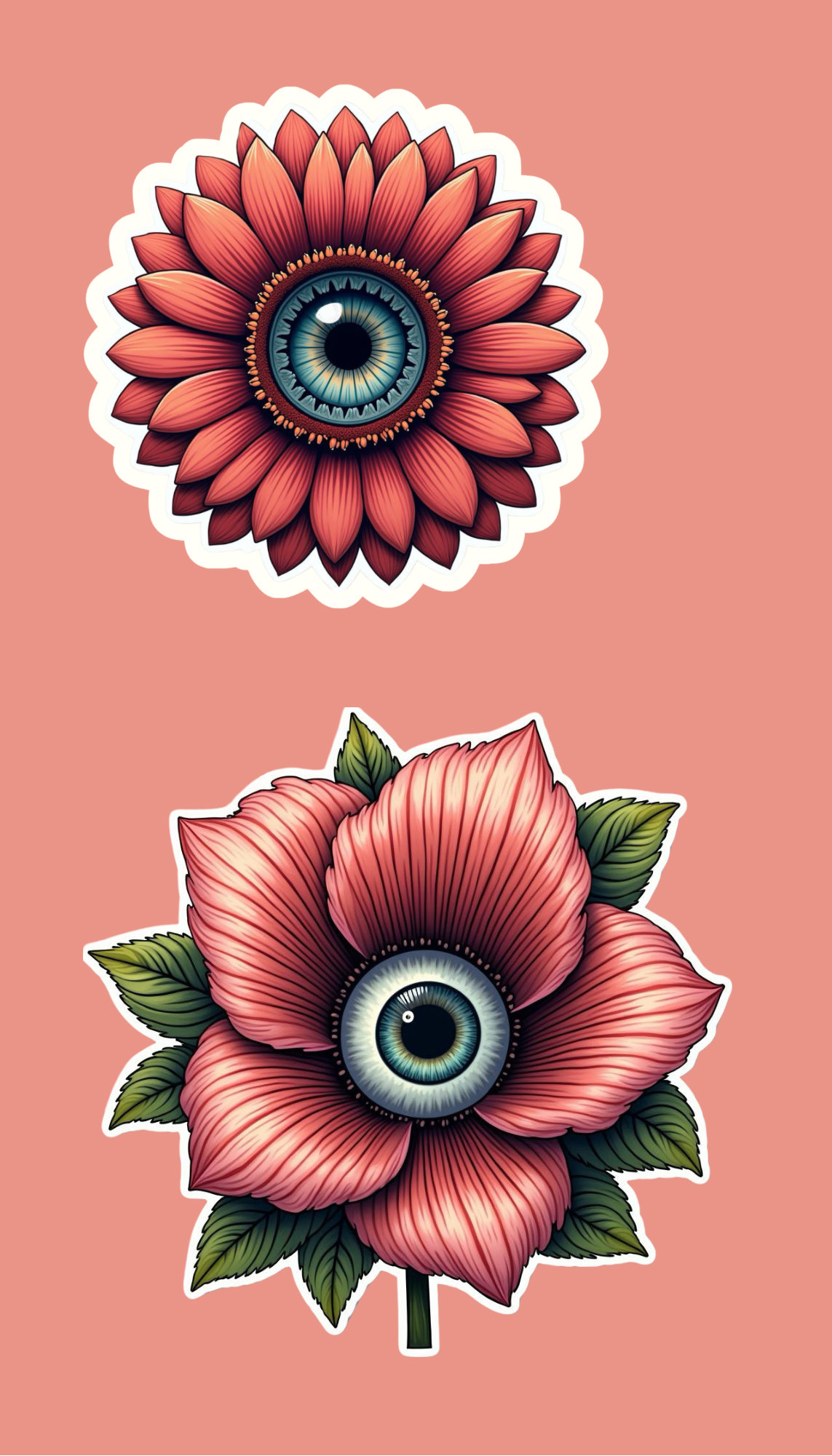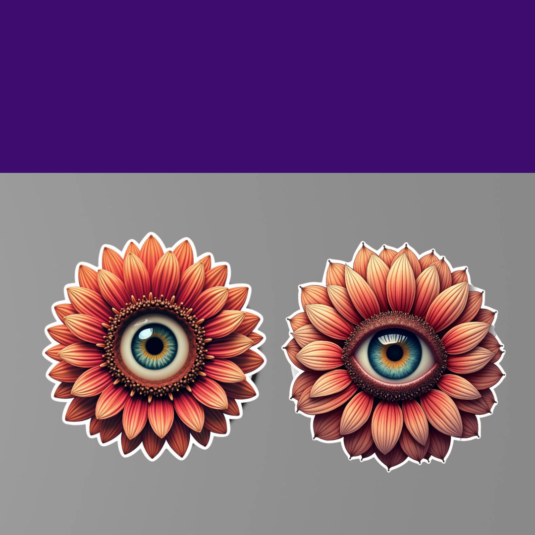 Enhance any surface with our Eye Flower Sticker Set. Each set includes 8 handmade stickers featuring a unique flower design with a striking eye in the center. At 2-3 inches each, these stickers are perfect for adding a touch of charm to any item. Plus, they are waterproof for long-lasting beauty.