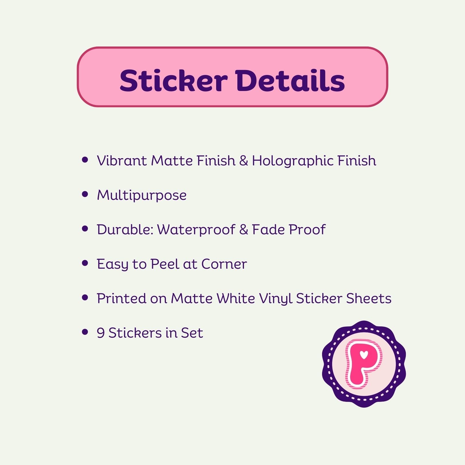 Stickers are sized at 2”x2” & 2”x2.5”