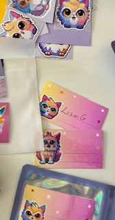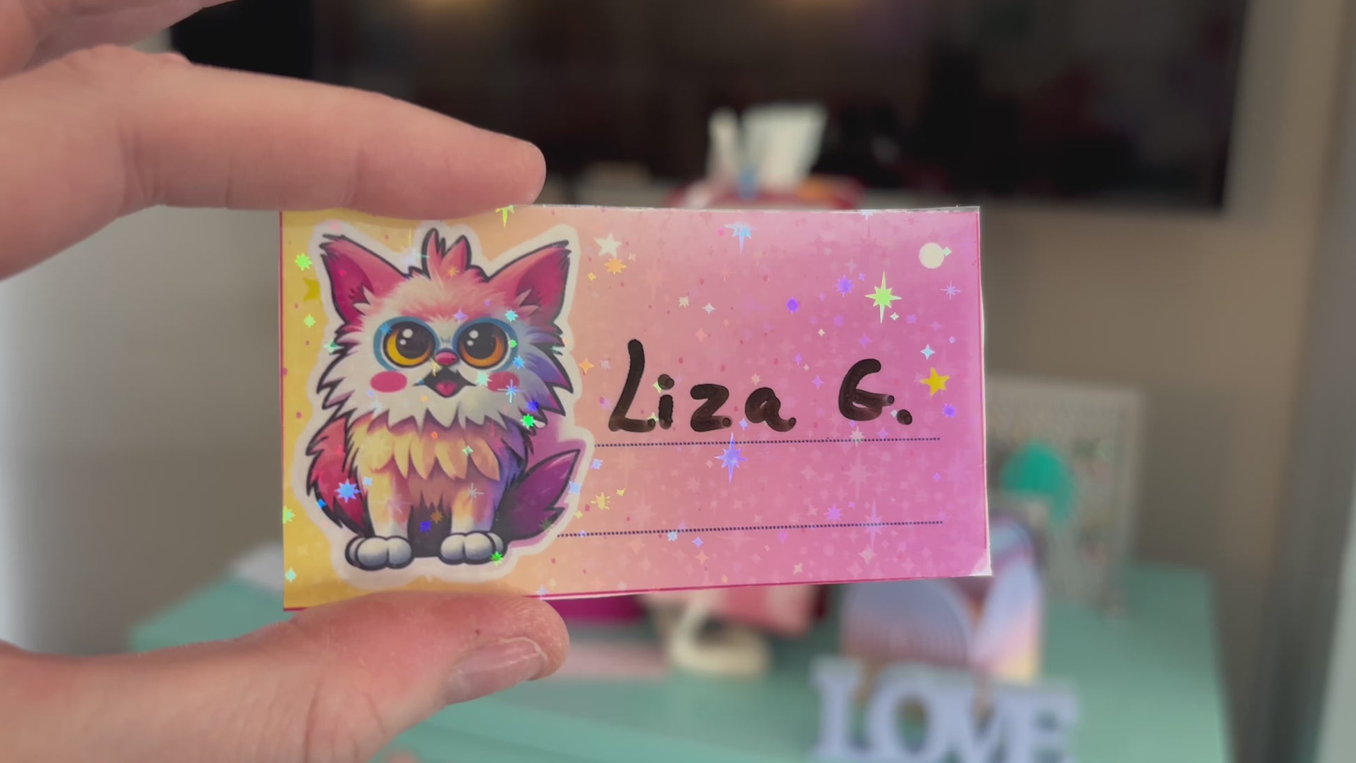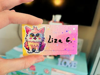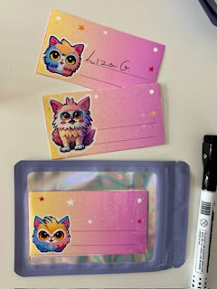 Make labeling a fun and colorful experience with our Furbittens Labels. This set includes 2 sheets of 3.5" wide x 2" tall matte and holographic labels featuring our cute collectible Furbittens characters. With 9 labels per sheet, these labels are perfect for daycare, preschool, back to school or adults. Easily write and customize with a pen or dry erase marker for reusable labeling. Labels are packaged in a compact lavender holographic pouch with see through window.