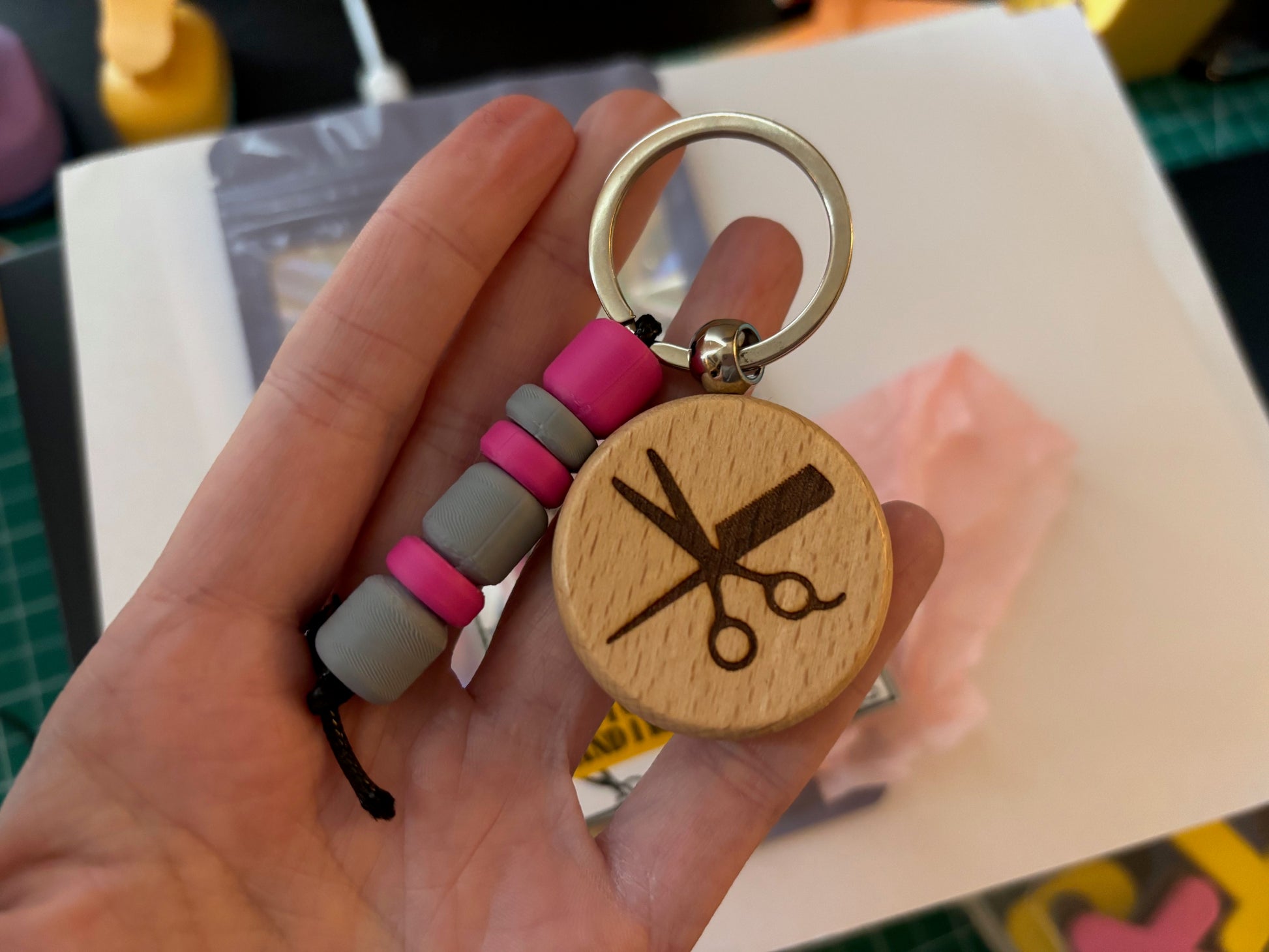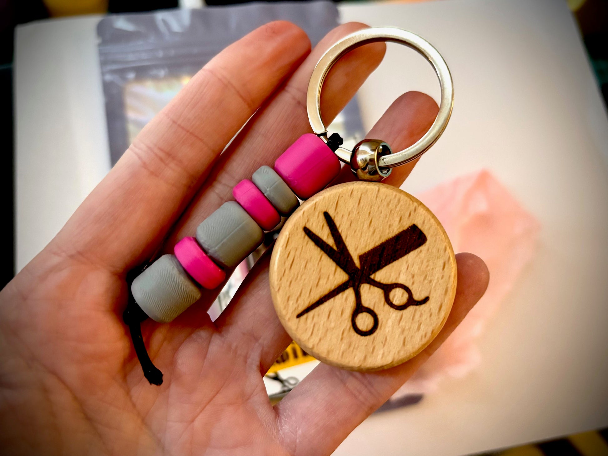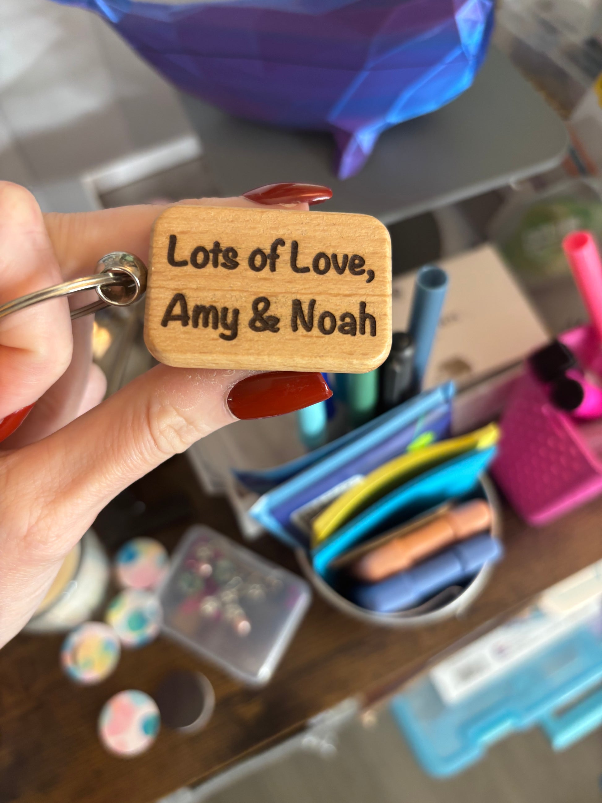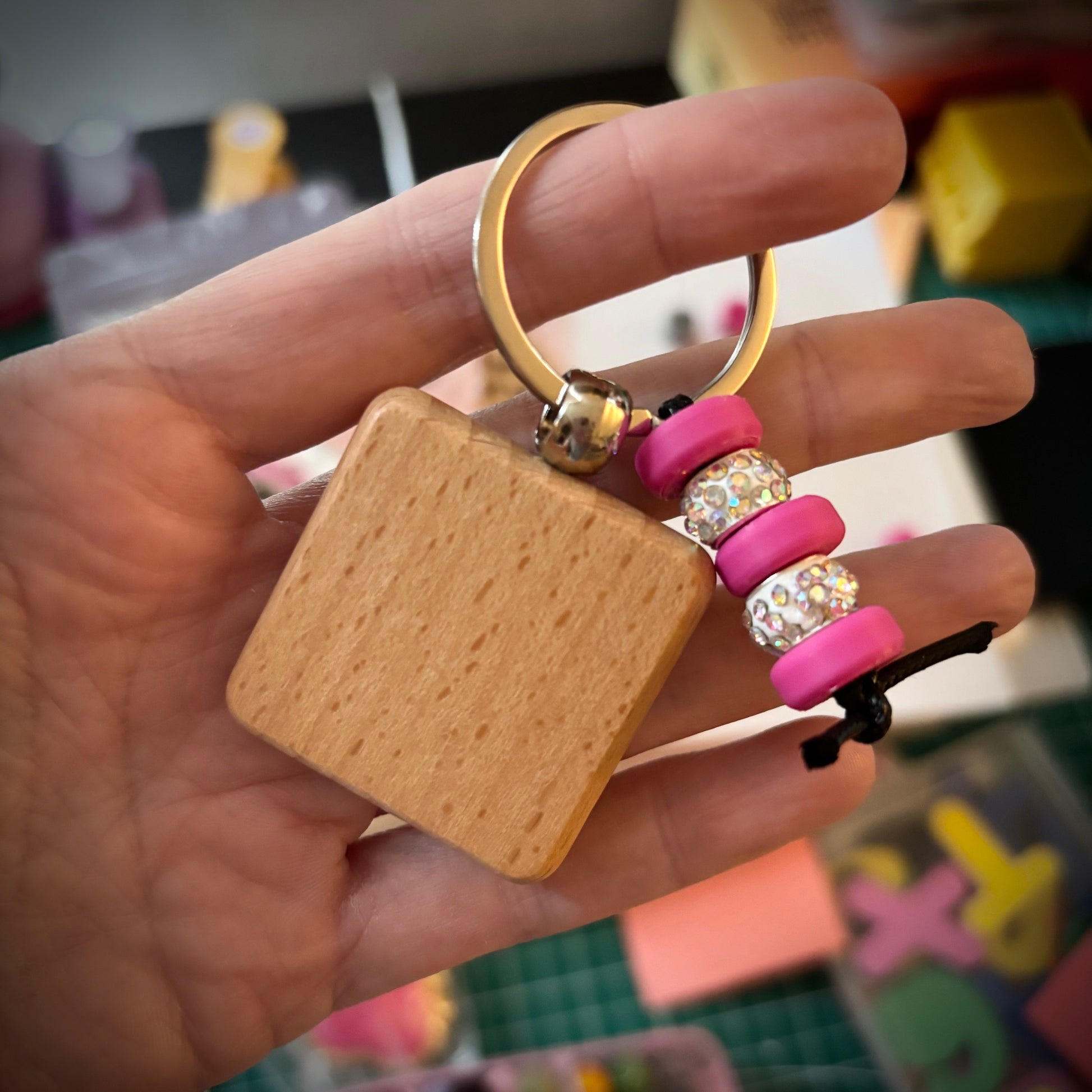 - Keychain Materials: Made of lightweight wood, which is sturdy with smooth edges and without any sharp corners. Select from 5 different shapes; circle, rectangle, square, oval or heart. The keyrings are made of sturdy steel. Comfortable to touch without being so delicate that it will break or become misshapen. In addition to personally engraving each character with our laser machine, I manfacture my own beads, and hand bead each keyring myself. Single keyring, or gift pack (thin flexi magnet included).