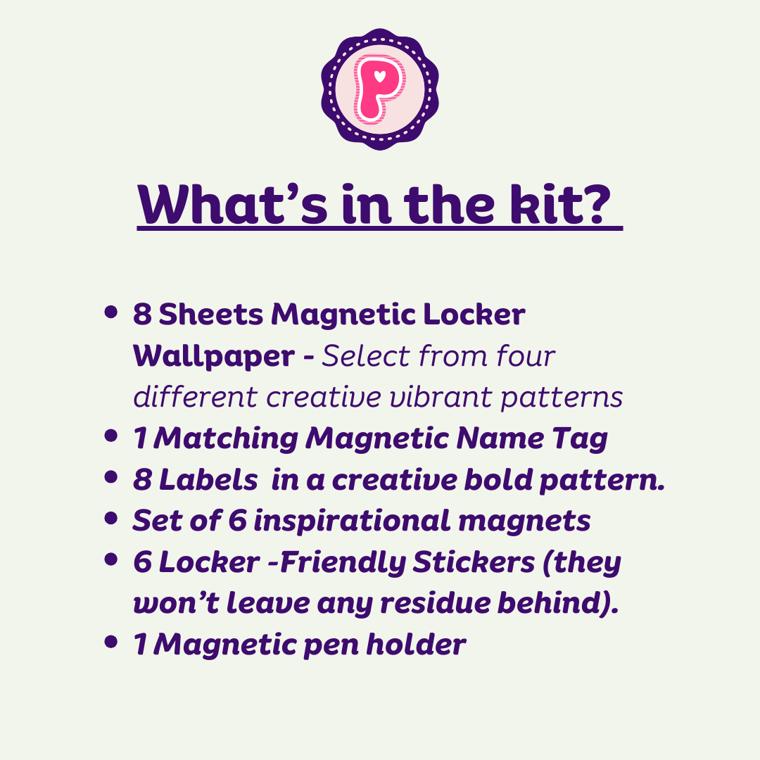 Introducing The Creative from our Your Brand Collection - designed to ignite creativity and brighten up any locker! This kit includes 8 magnetic wallpaper sheets, a pen holder, name tag, and labels, as well as inspirational magnets and locker safe, waterproof stickers. Enhance your locker with vibrant colors and motivational messages.