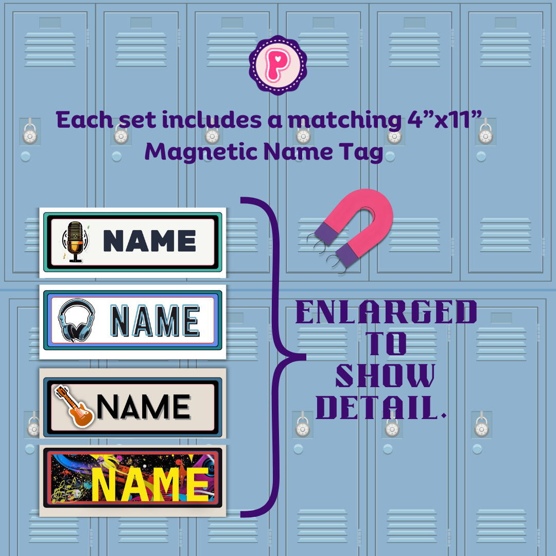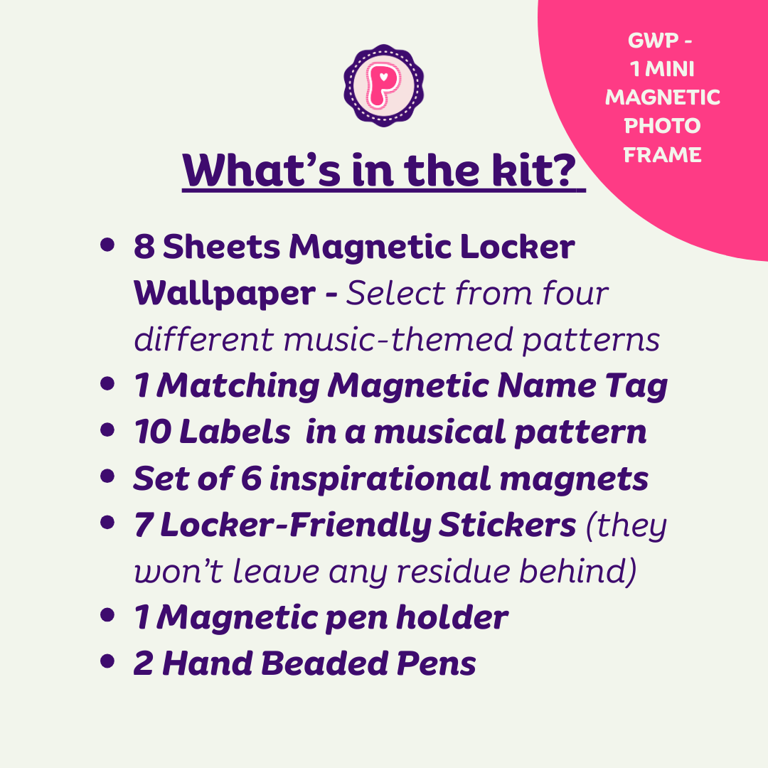 The Musician Locker Wallpaper Kit from the Your Brand Collection offers a complete and stylish solution for personalizing lockers with a musical flair. Featuring 8 magnetic wallpaper sheets available in four distinct music-themed designs, this kit also includes a matching magnetic name tag and 10 coordinated labels to keep things organized. Inspire creativity with 6 motivational magnets, 7 temporary stickers, and practical accessories like a magnetic pen holder and two hand-beaded pens. Enjoy an exclusive mini magnetic photo frame gift with purchase, while supplies last. Proudly made in the USA, this kit combines function and flair for any music lover’s space.