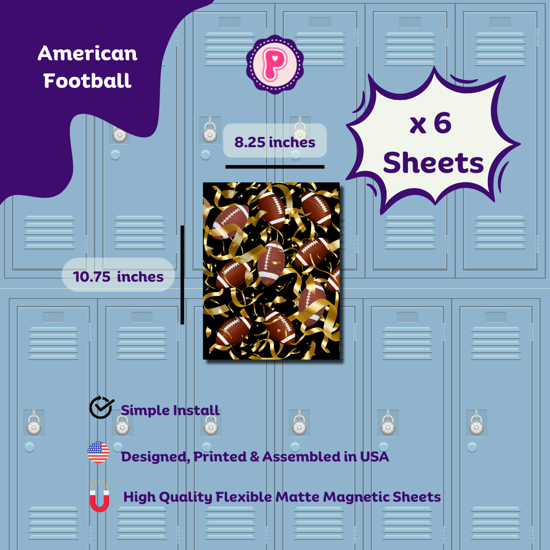 This Magnetic Locker Wallpaper Football Collection offers six sheets featuring authentic American Football and Soccer/Football patterns, ideal for personalizing any locker interior or exterior. Each sheet is slightly smaller than letter size, ensuring easy application and a perfect fit. Designed for sports enthusiasts, this collection combines durability with vibrant designs to enhance your locker space with a professional touch.