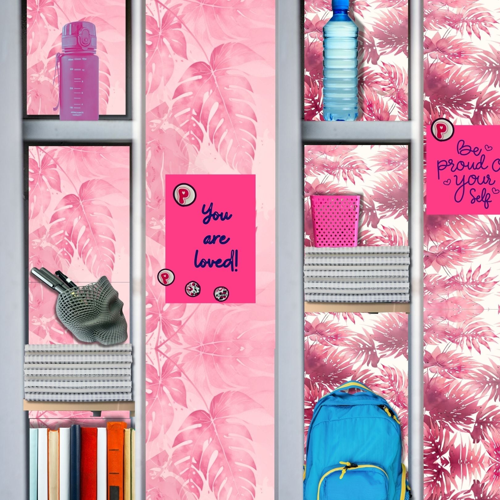 Introducing our collection of magnetic locker wallpaper, now available in Pink Tropical Leaves! Made in the USA with a matte finish, each package contains 4 sheets of magnetic wallpaper. Transform your locker with this stylish and functional addition.