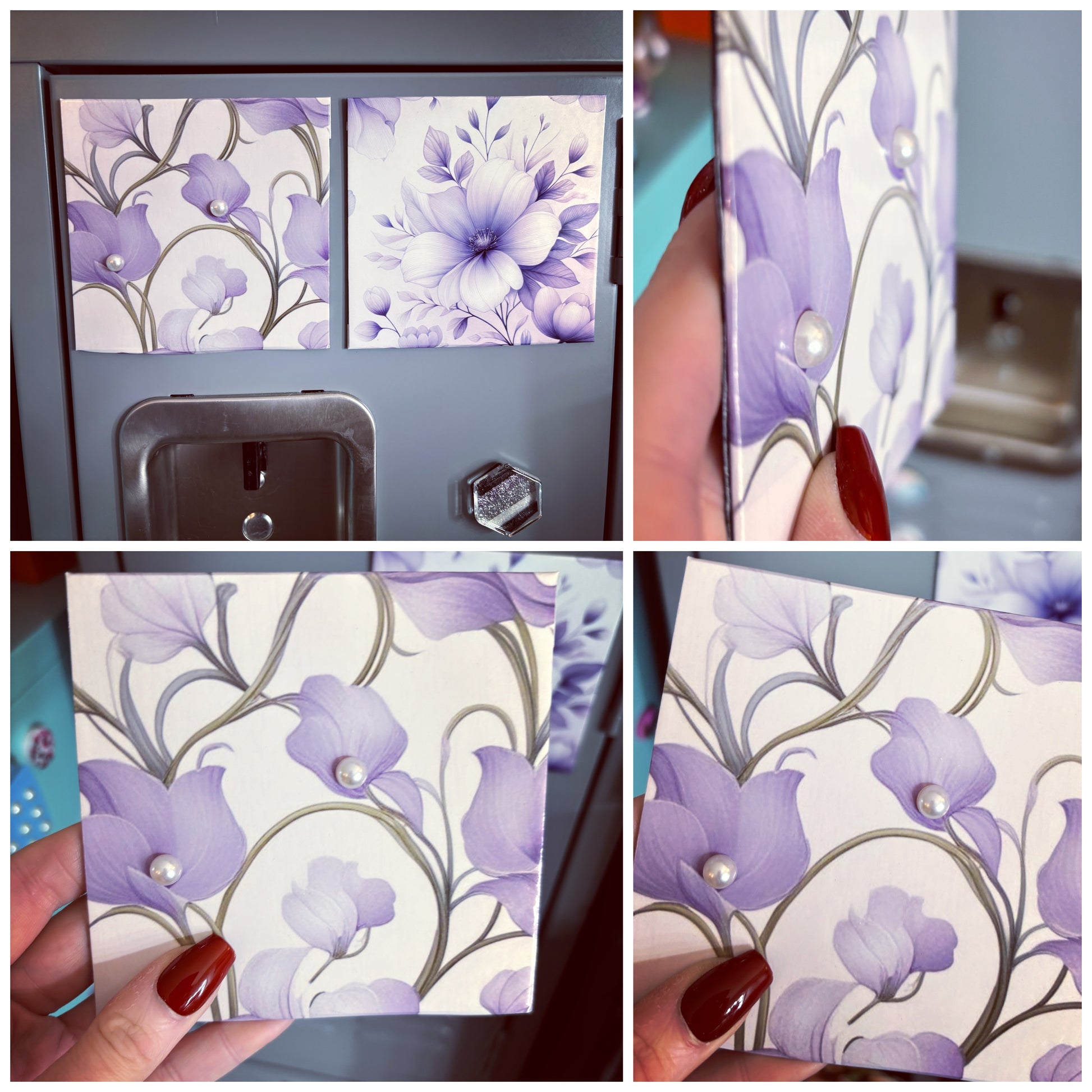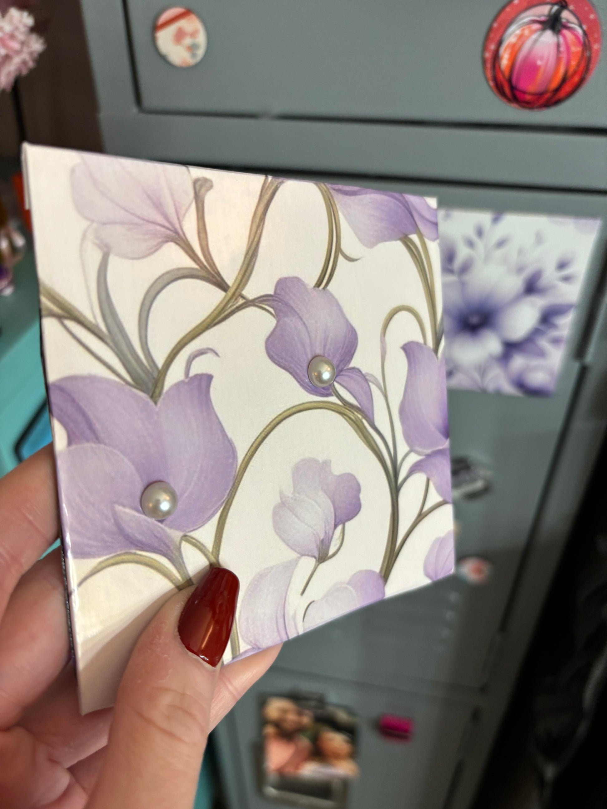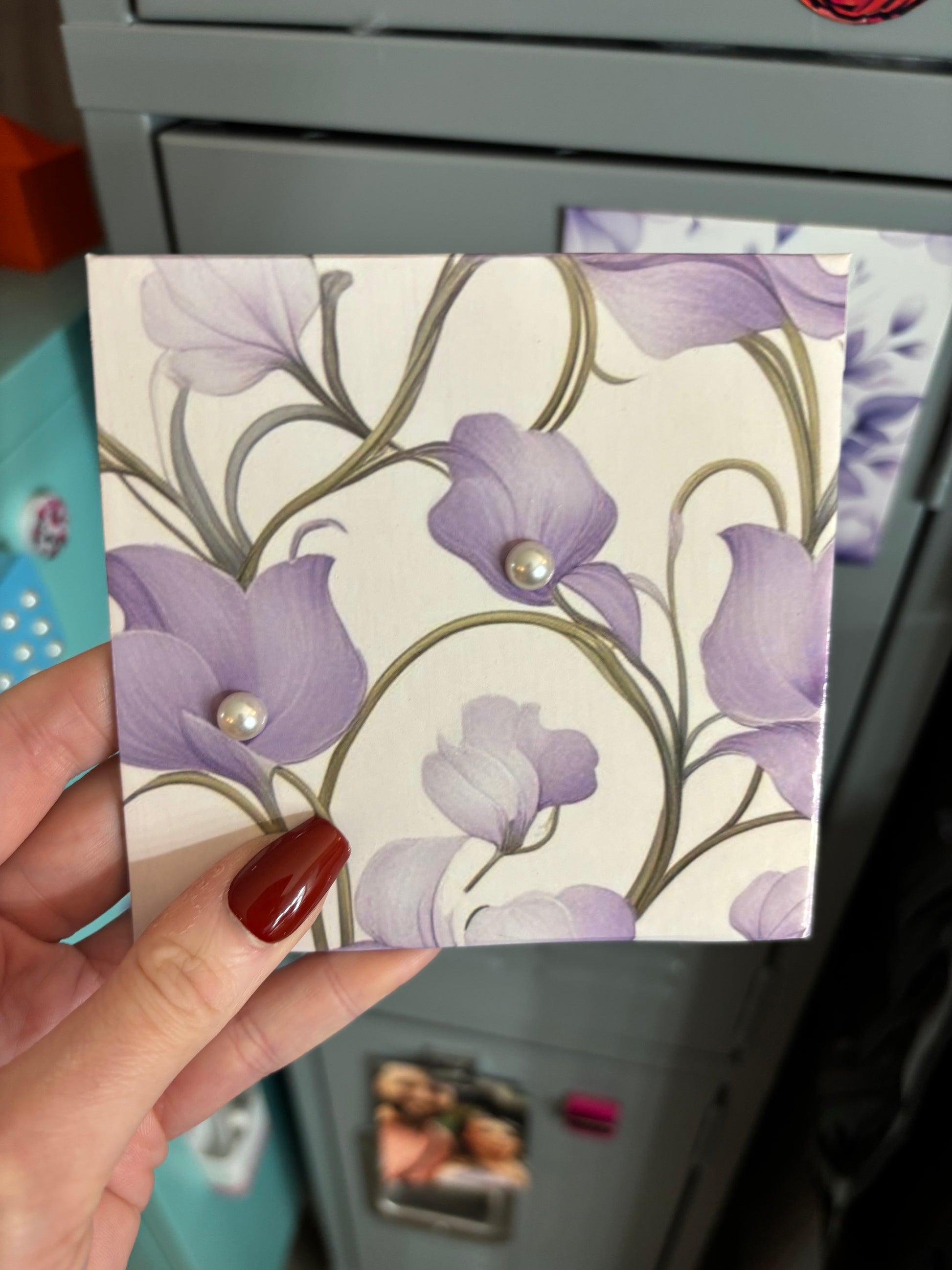 These 3.5 inch magnetic tiles are made with vinyl wrapped over a stiff chip board and feature a magnet backing. The pattern is violet and white floral with 3D pearly white dots as an option. Six tiles in a pack.