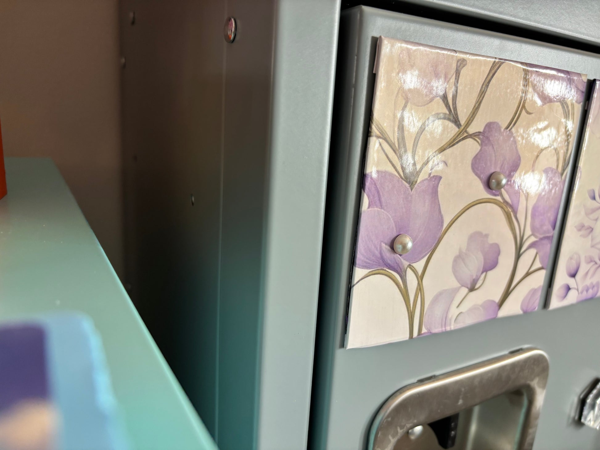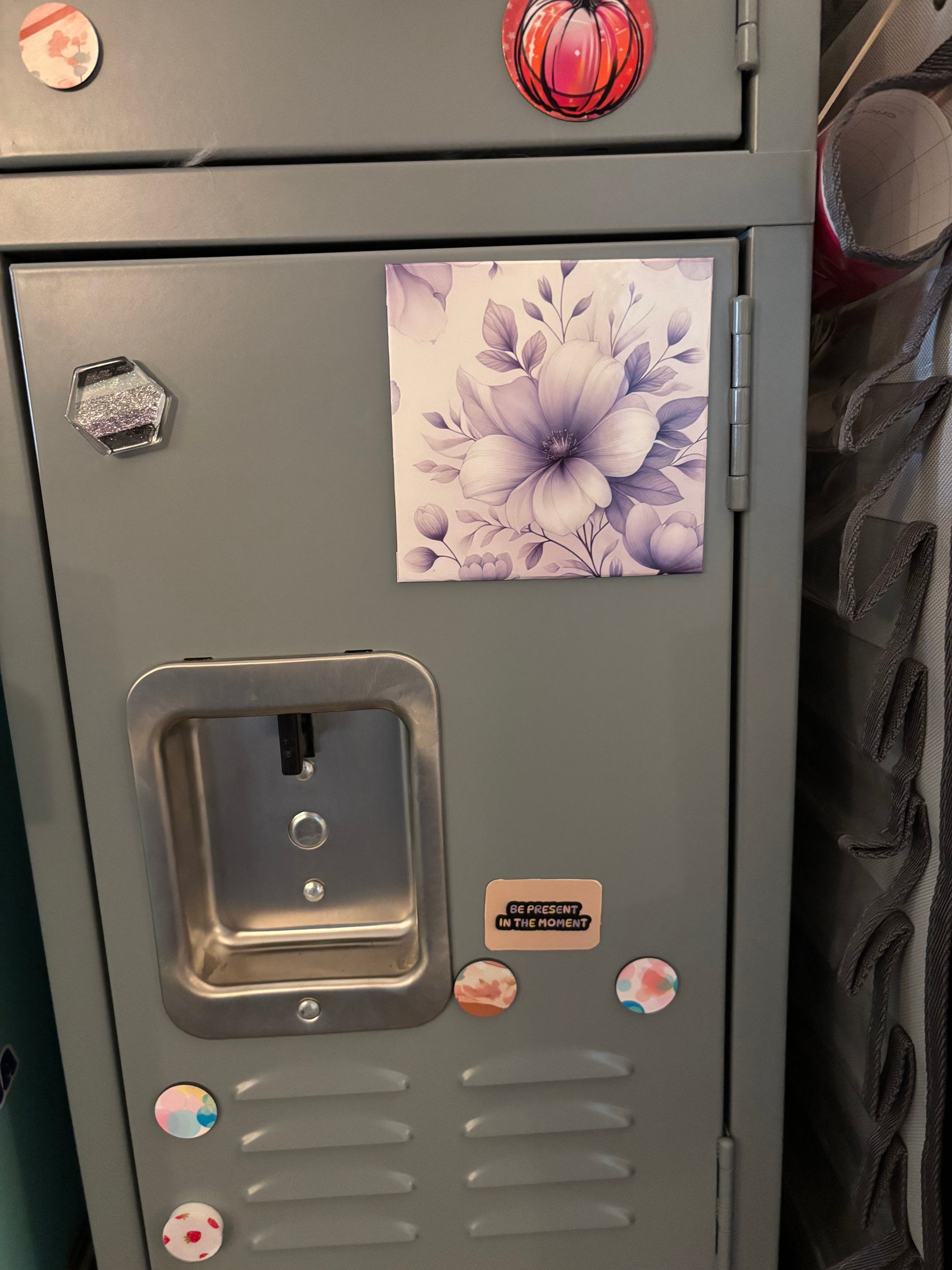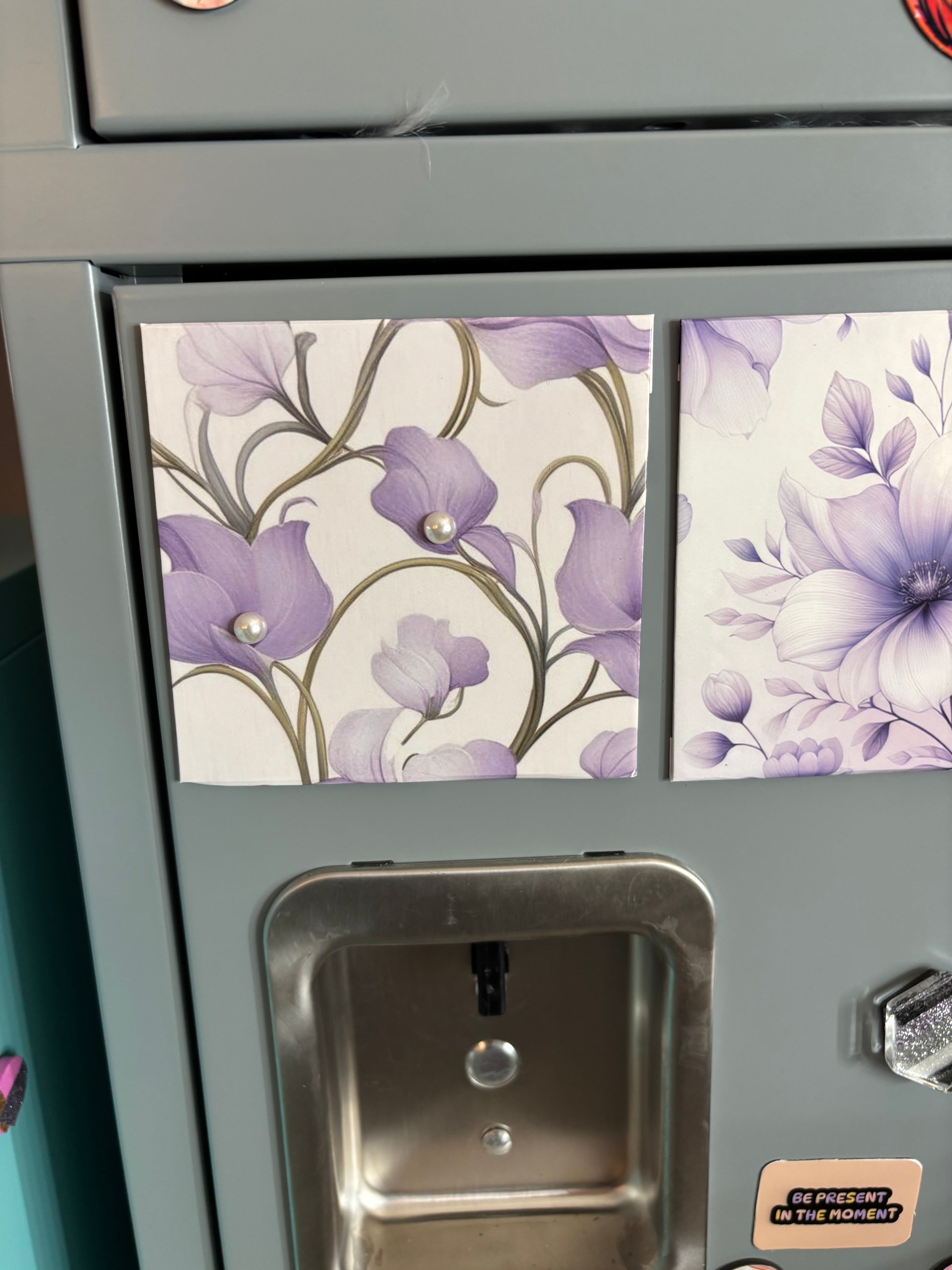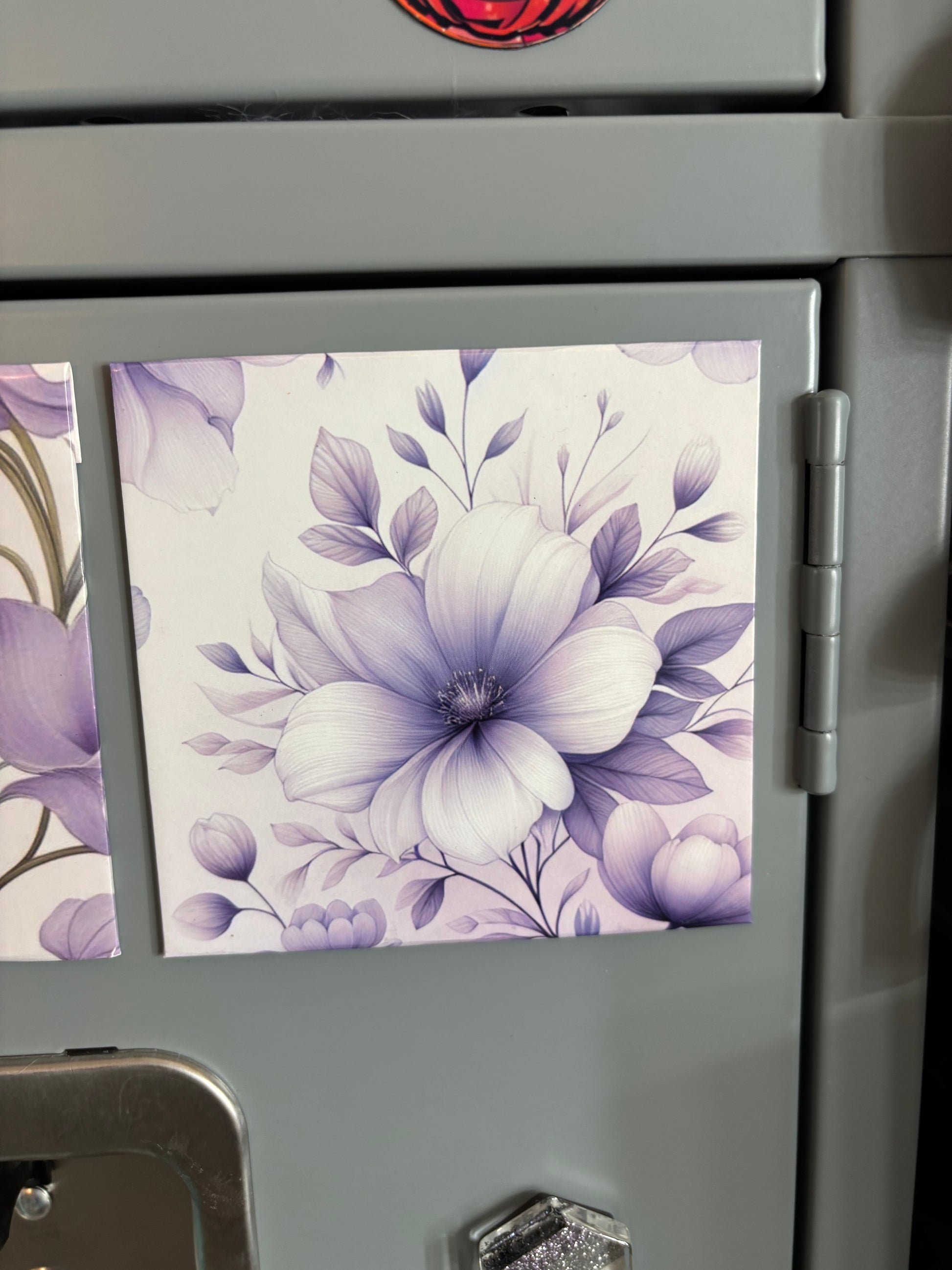 These 3.5 inch magnetic tiles are made with vinyl wrapped over a stiff chip board and feature a magnet backing. The pattern is violet and white floral with 3D pearly white dots as an option. Six tiles in a pack.