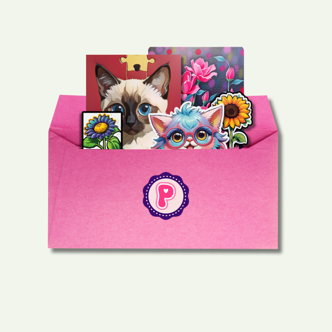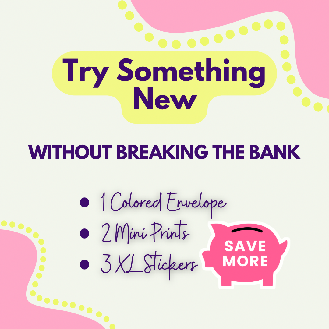 Discover the fun with our Mystery Value Envelope! For only $10, receive 2 mini prints and 3 extra large stickers in a brightly colored envelope. Plus, some envelopes include a bonus item, like our new Sticker Sisters Collector’s Card in Sweetie. Perfect for saving money while trying new products.