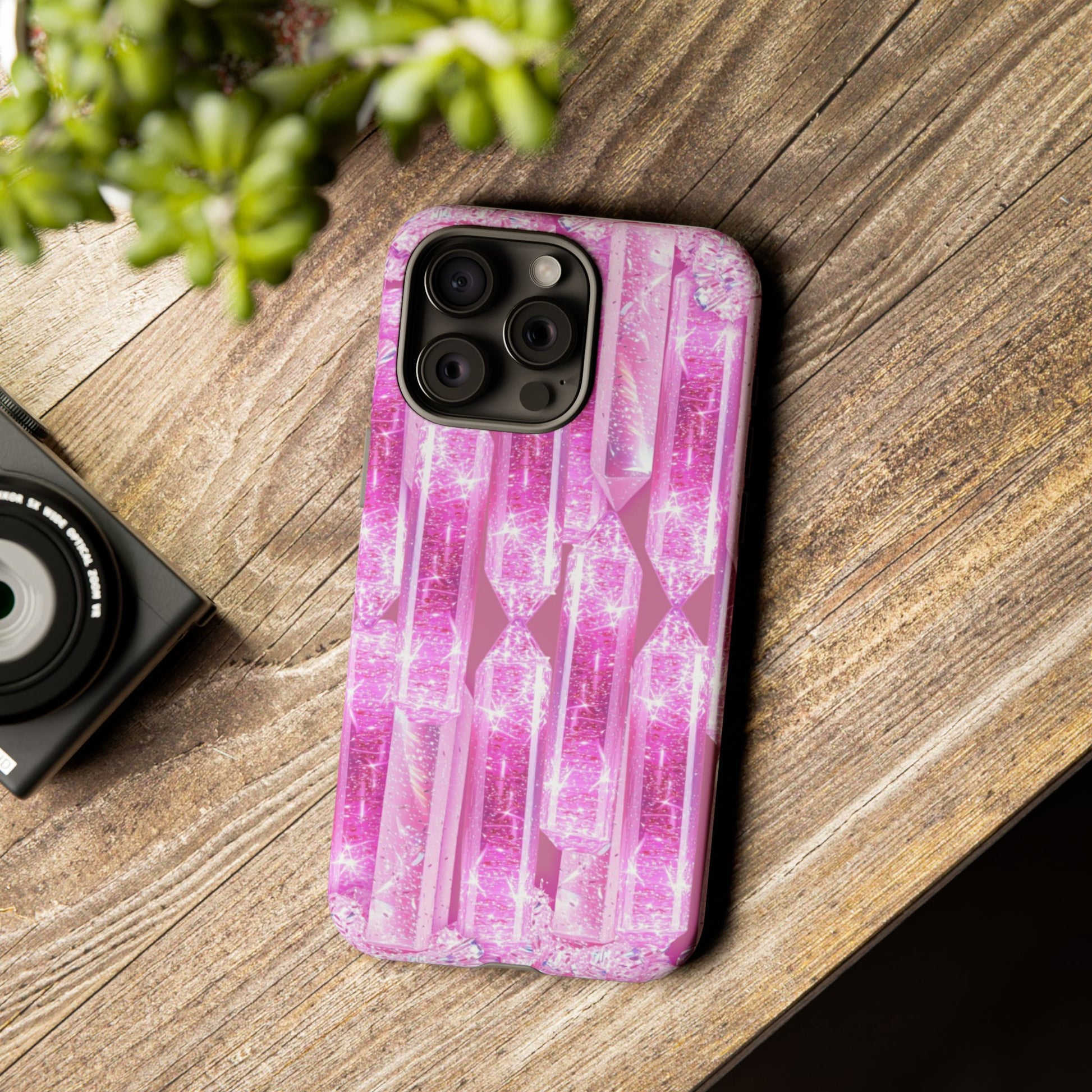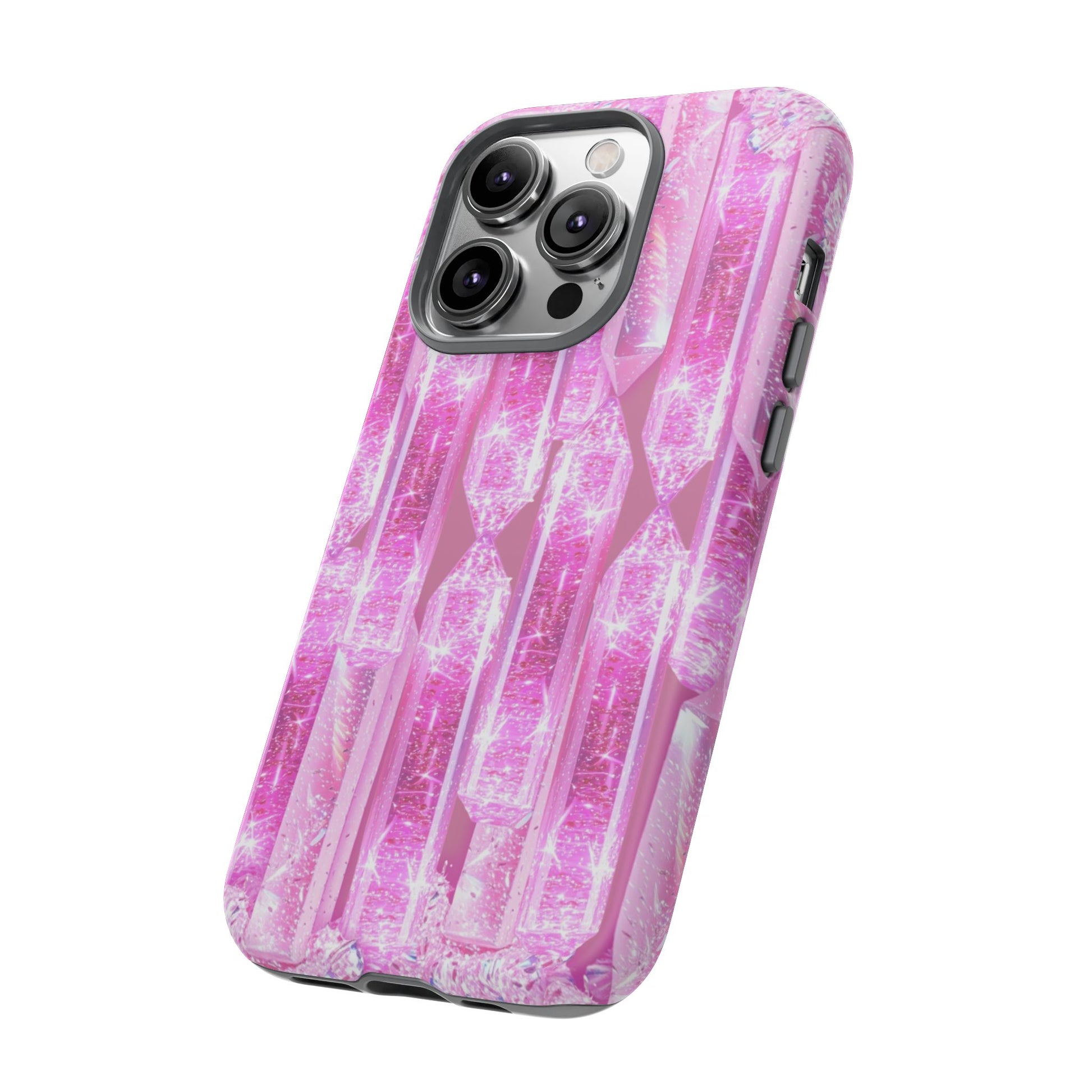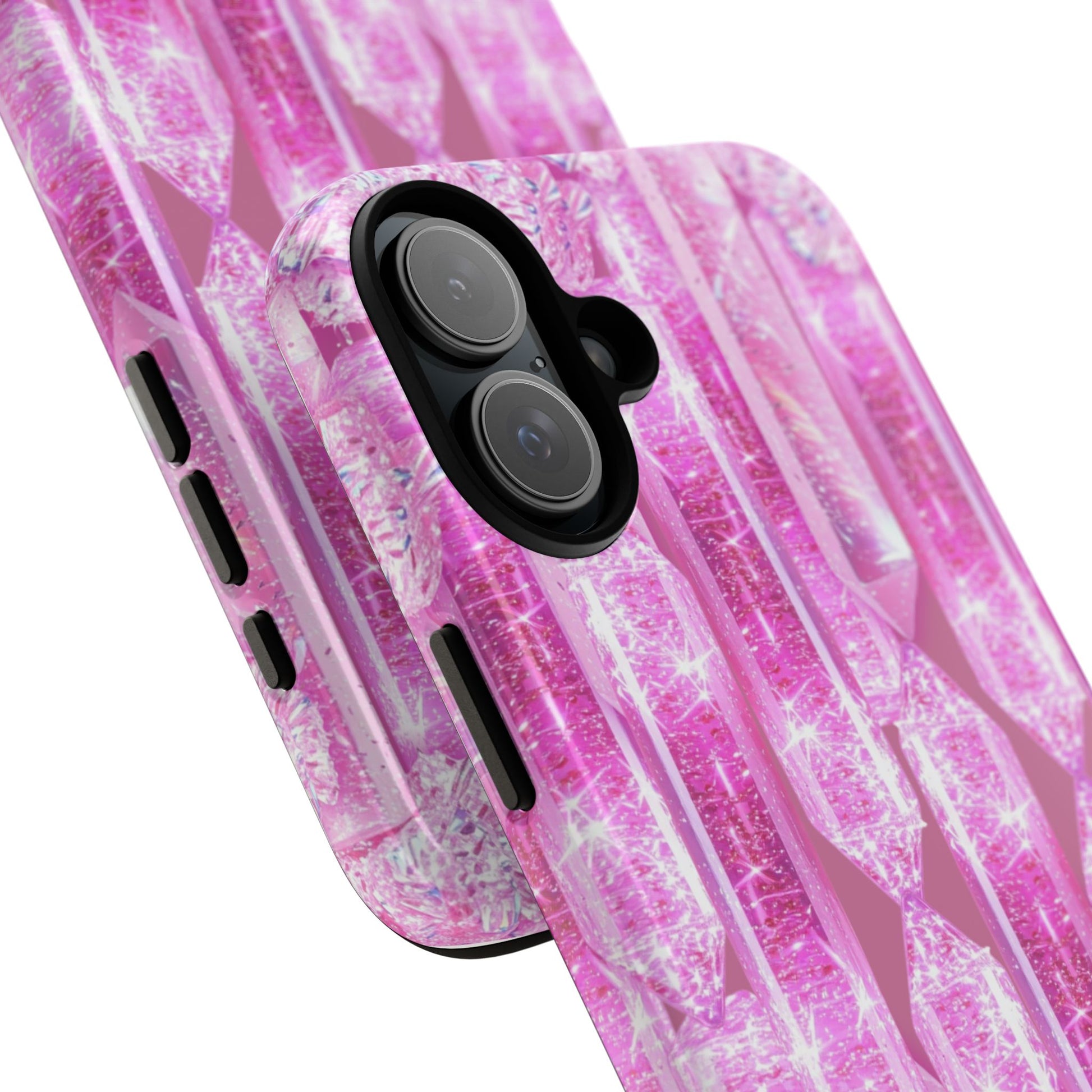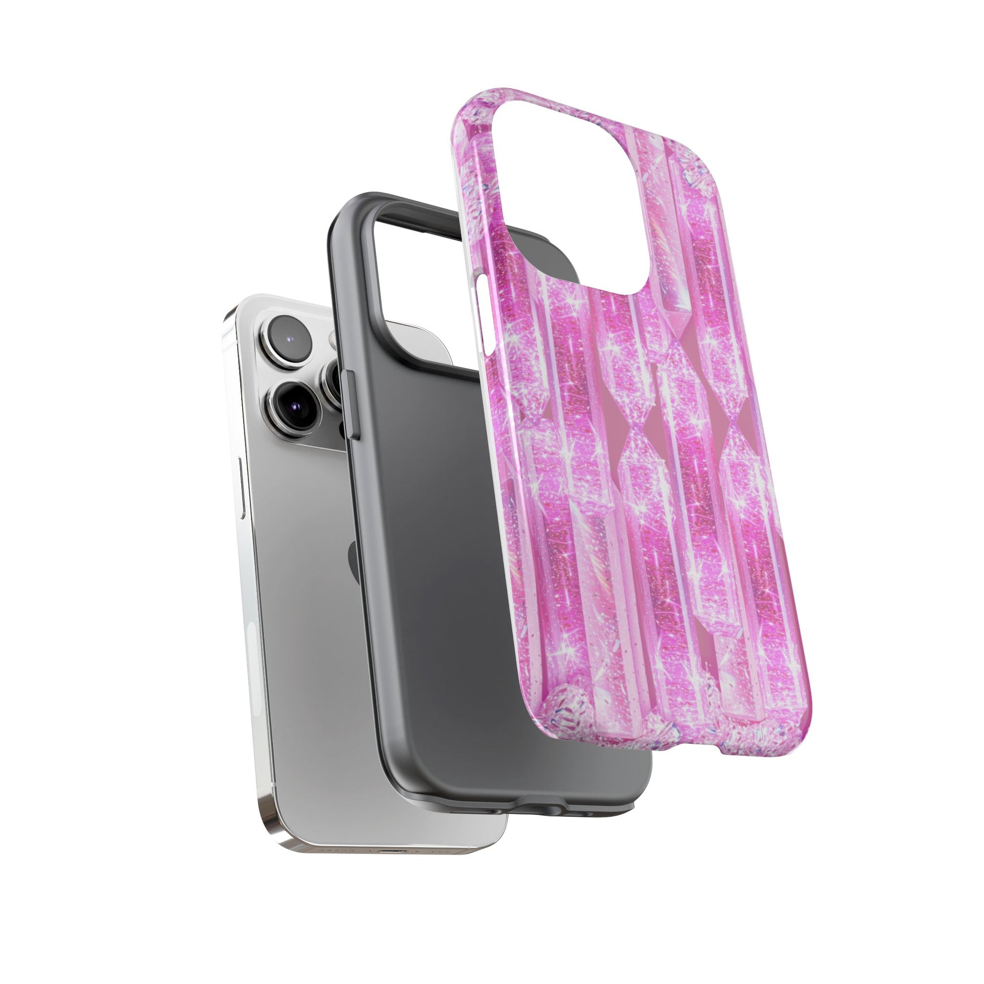 A glossy dual-layer phone case that turns your device into a sparkly statement piece. The design features shimmering pink crystal-like rods and glittery accents that catch light and attention, wrapped edge-to-edge with full 3D ink transfer. Inside, a soft TPU silicone liner cushions against drops while the polycarbonate shell resists impacts. Weather-resistant UV protection keeps the colors vivid, and precise cutouts leave ports and wireless charging accessible. Carry a playful, feminine shimmer that blends protection with candy-colored style.