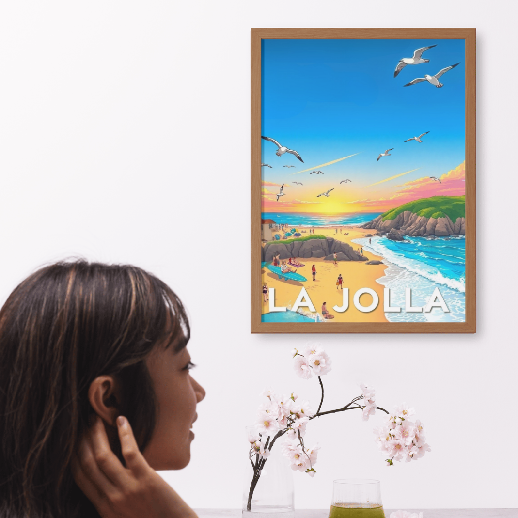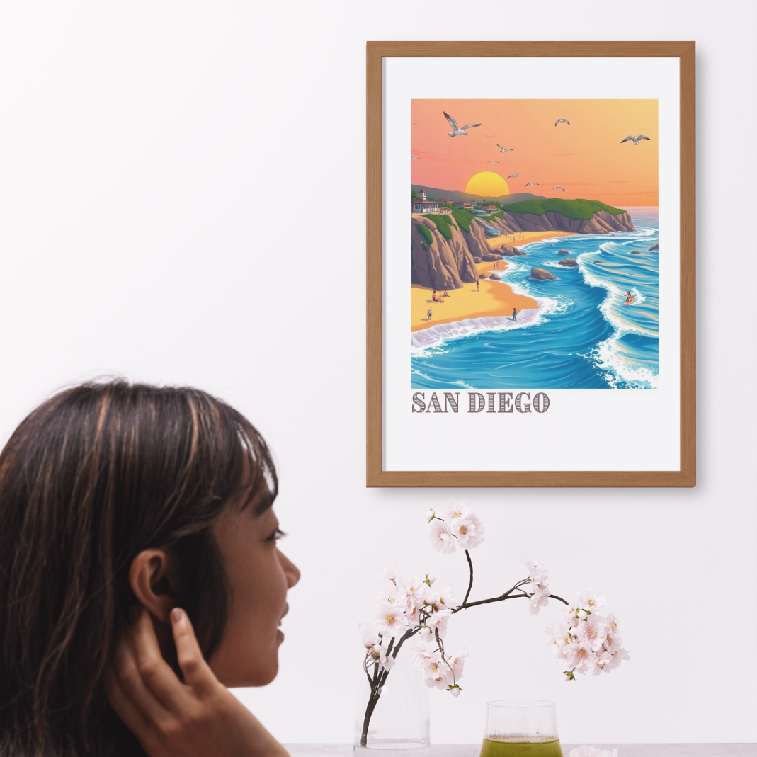 Enhance your wall decor with our San Diego Poster. Choose from 3 unique designs - one featuring a striking digital illustration of Balboa Park, and the other two showcasing beautiful beach scenes. Each poster is expertly crafted and makes for a stunning addition to any home or office space.