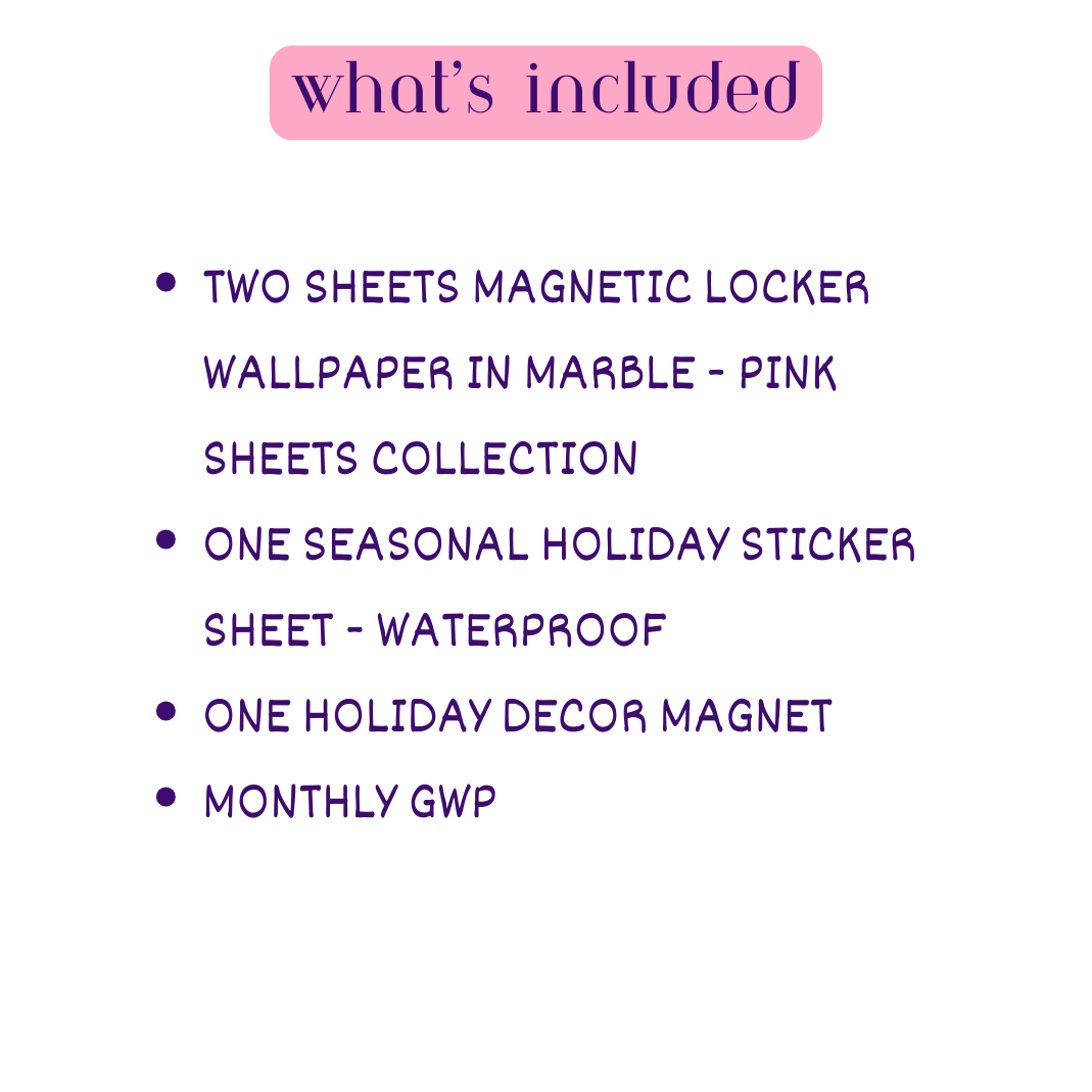Discover the Seasonal Starter Bundle, expertly curated to blend everyday elegance with festive flair. This set includes two sheets of our popular pink marble magnetic wallpaper, a waterproof seasonal sticker sheet, a holiday decor magnet, and our exclusive monthly gift with purchase. Ideal for effortlessly updating your space with versatile, high-quality magnetic décor that adapts to both daily style and seasonal celebration.