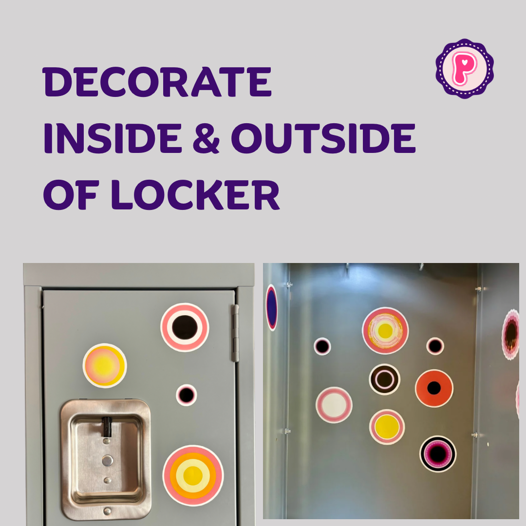 Elevate your organizational game with our Temporary Circle Sticker Set. Perfect for lockers, file cabinets, and desk drawers, each set includes 8 sheets of circular stickers. Easily decorate your belongings with these water resistant stickers. One set is perfect for a small personal locker and comes in a convenient, clear plastic bag.