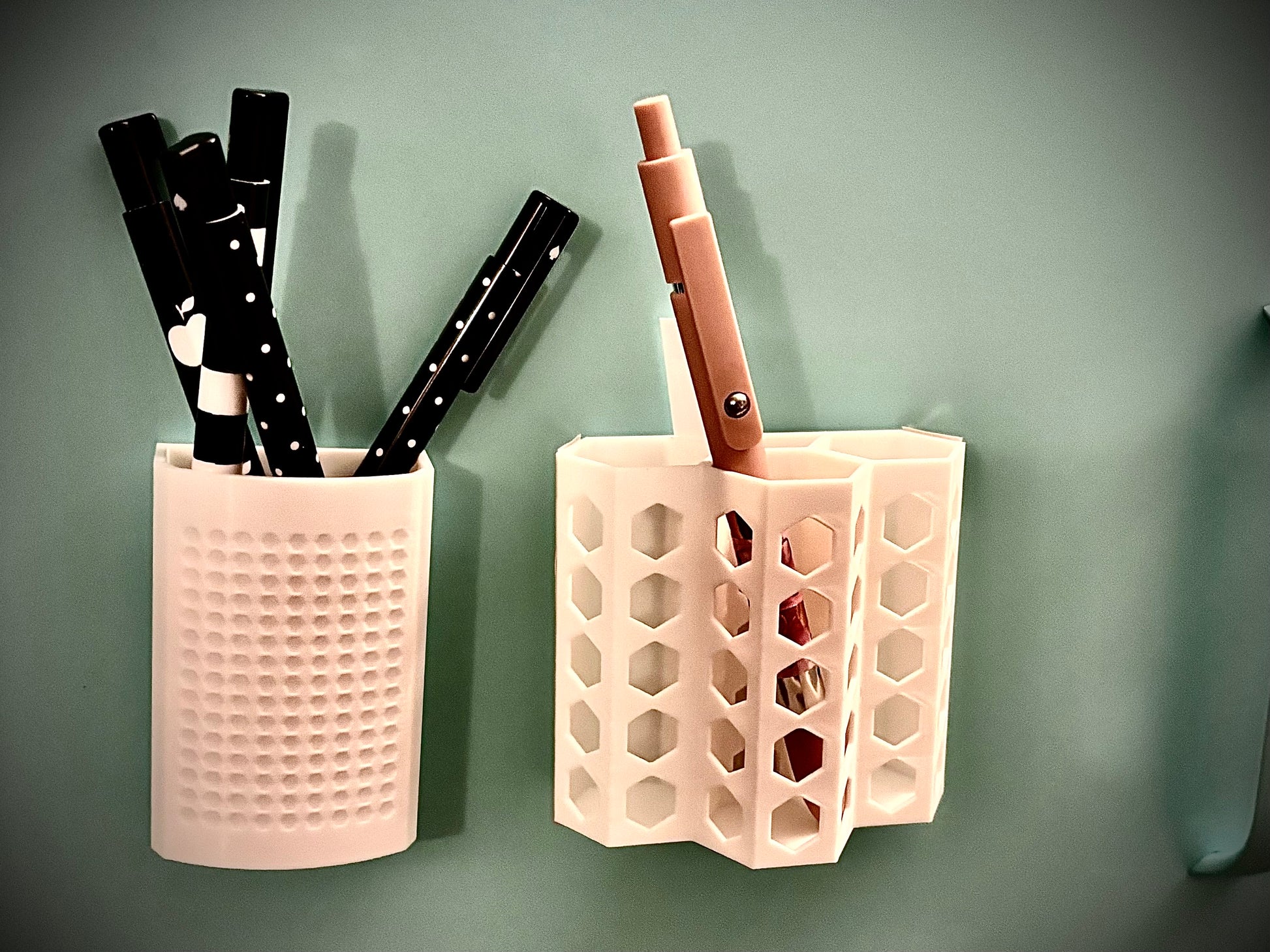 Our 2-piece Magnetic Pen Holder set is perfect for classrooms, offices, and homes. The compact holder includes a strong magnetic strip that easily attaches to common surfaces like whiteboards, lockers, and refrigerators. The redesigned larger holder integrates concealed rare earth magnets for enhanced stability. Made from sturdy PLA filament and manufactured in the USA, these practical organizers are available in multiple colors and can comfortably accommodate several pens and pencils.